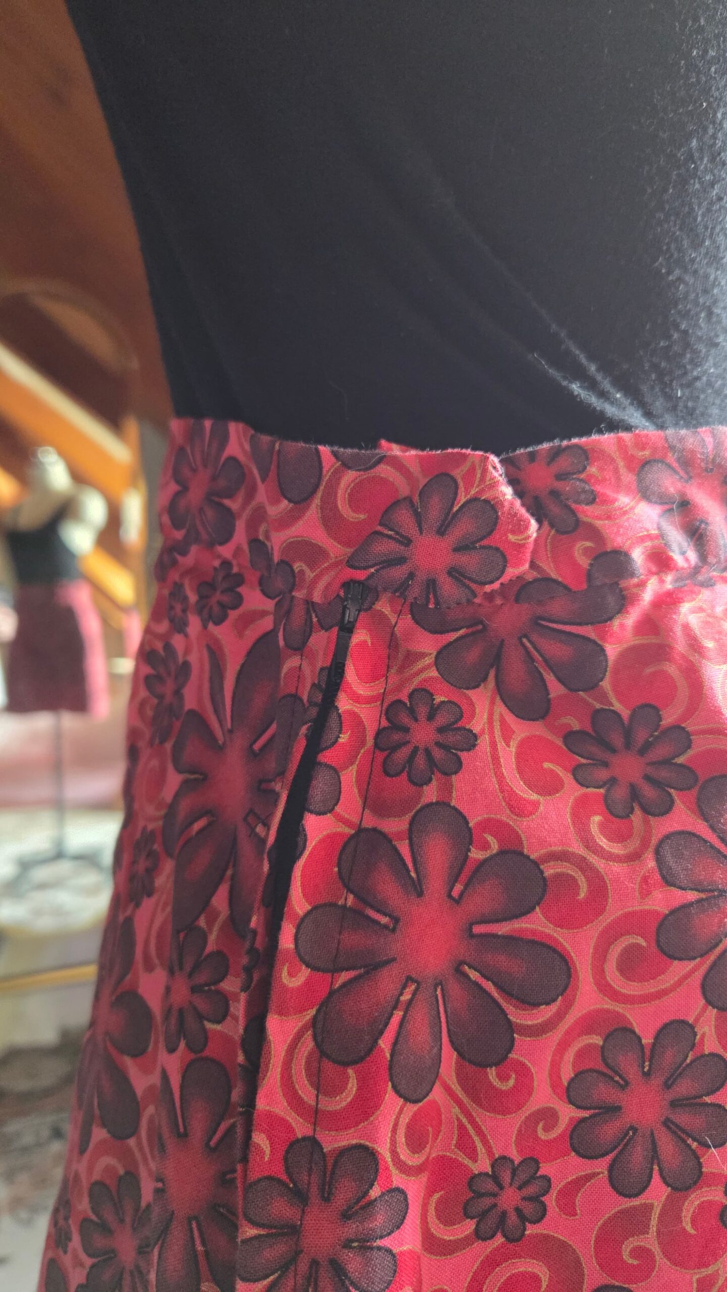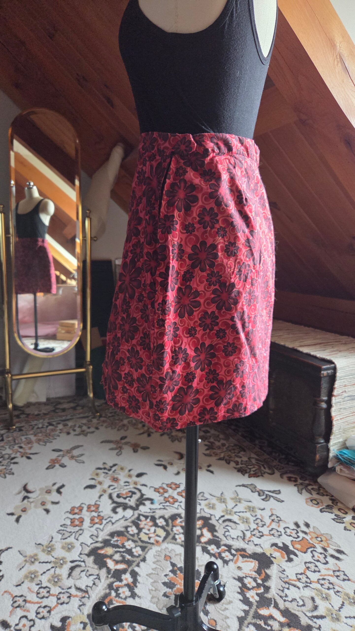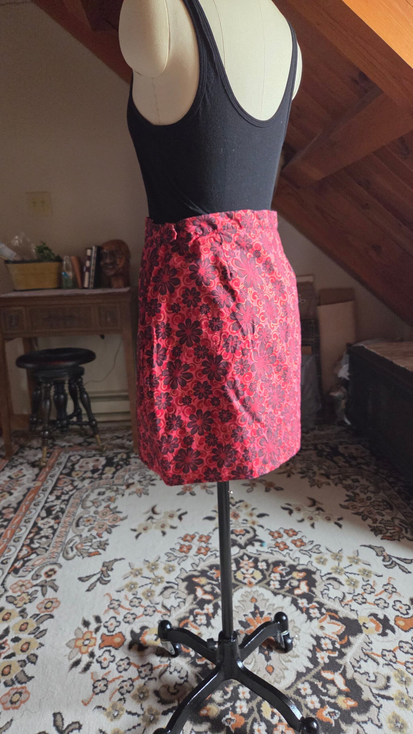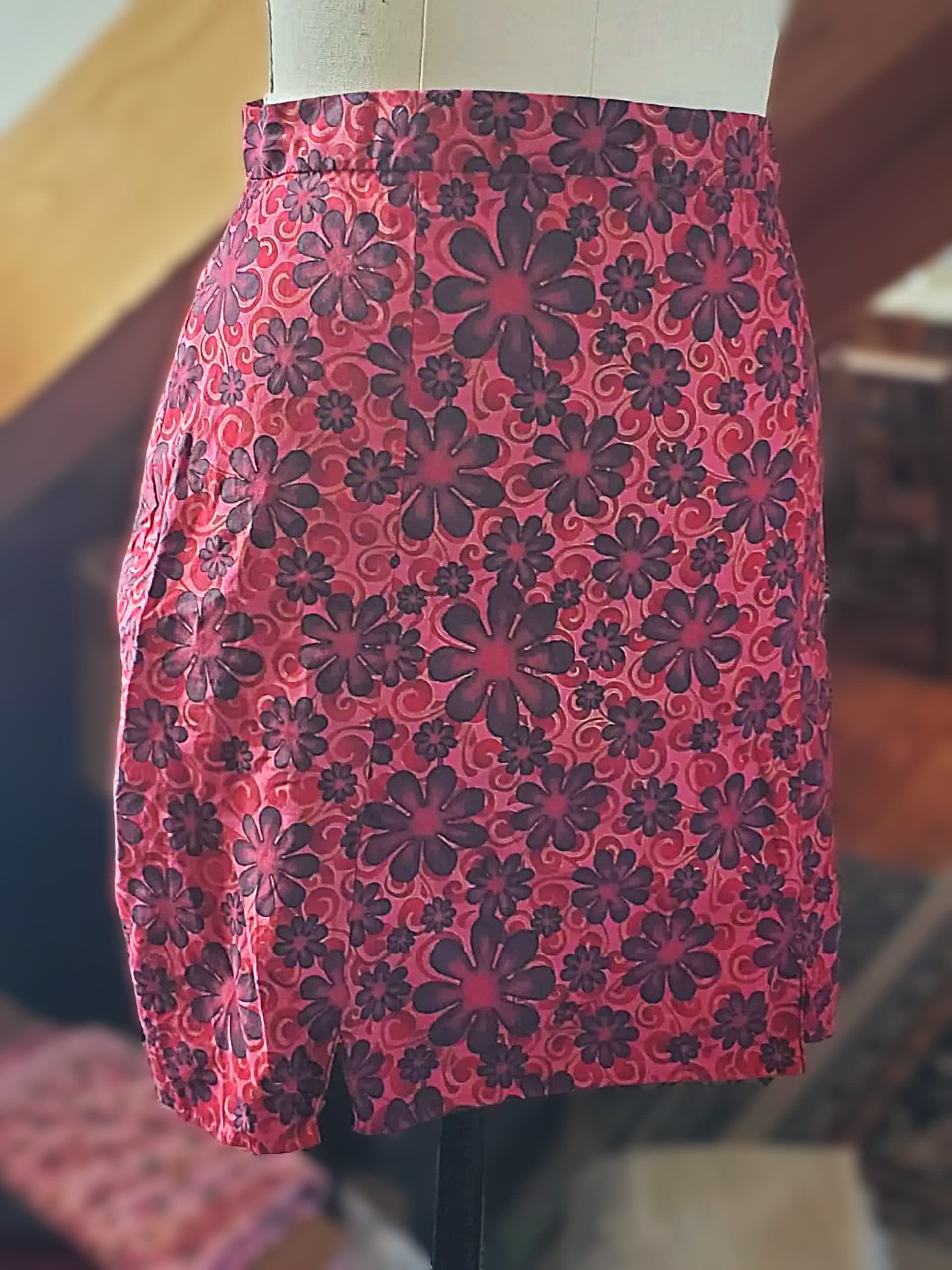 I found this beautiful pink‑and‑red floral material while thrifting and immediately knew it needed to become a 1960s‑inspired mini skirt—partly because of the bold pattern, and partly because the limited yardage practically demanded a smaller silhouette. The skirt is made from cotton and finished with a zipper and hook‑and‑eye closures at the waistband, keeping the construction simple and true to the era’s clean lines.