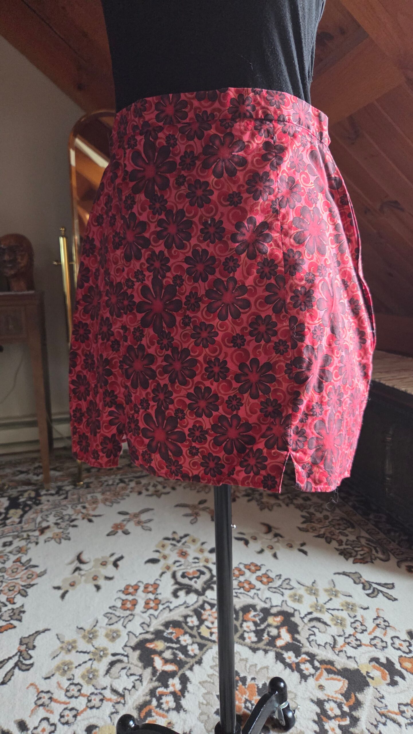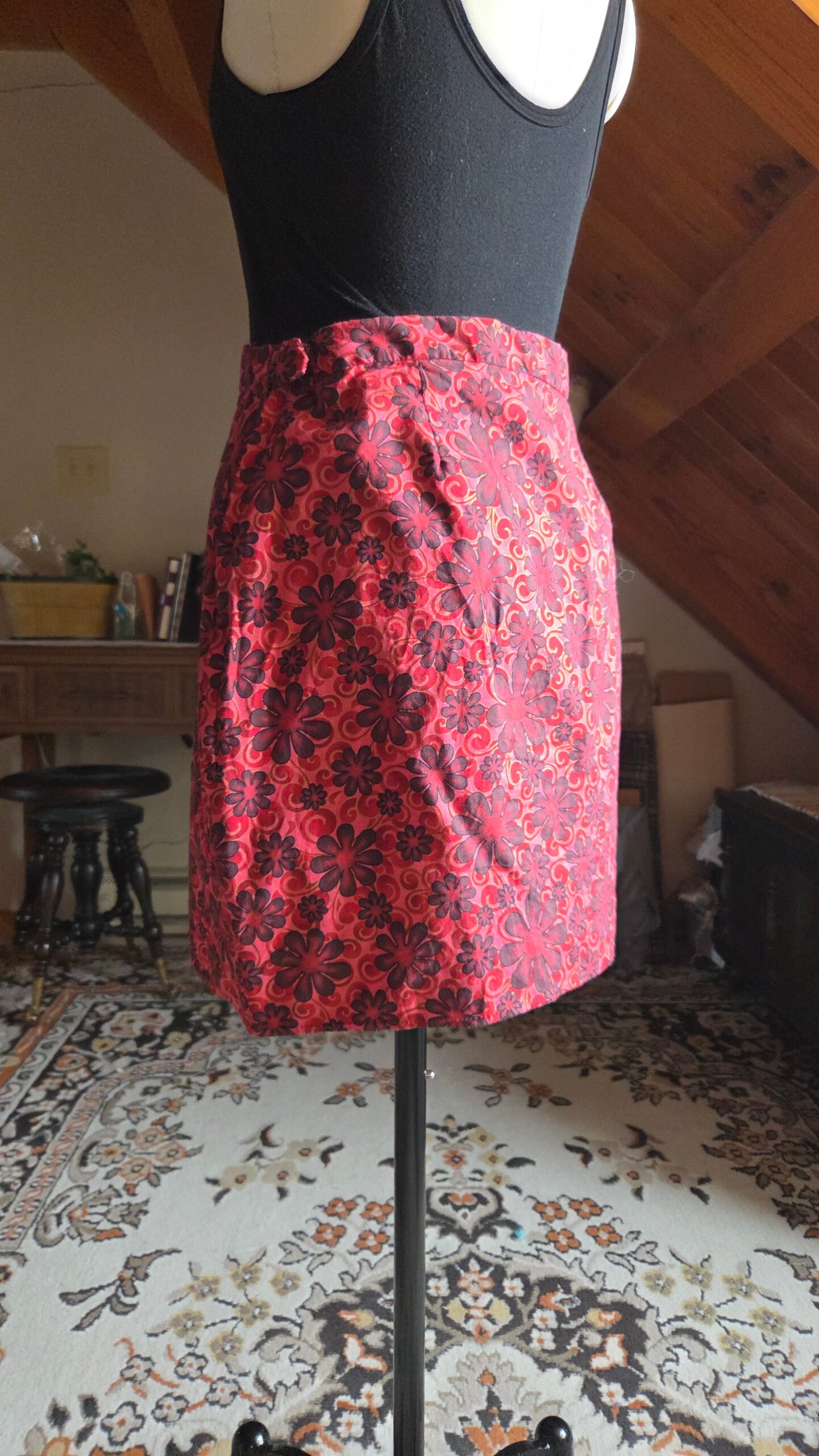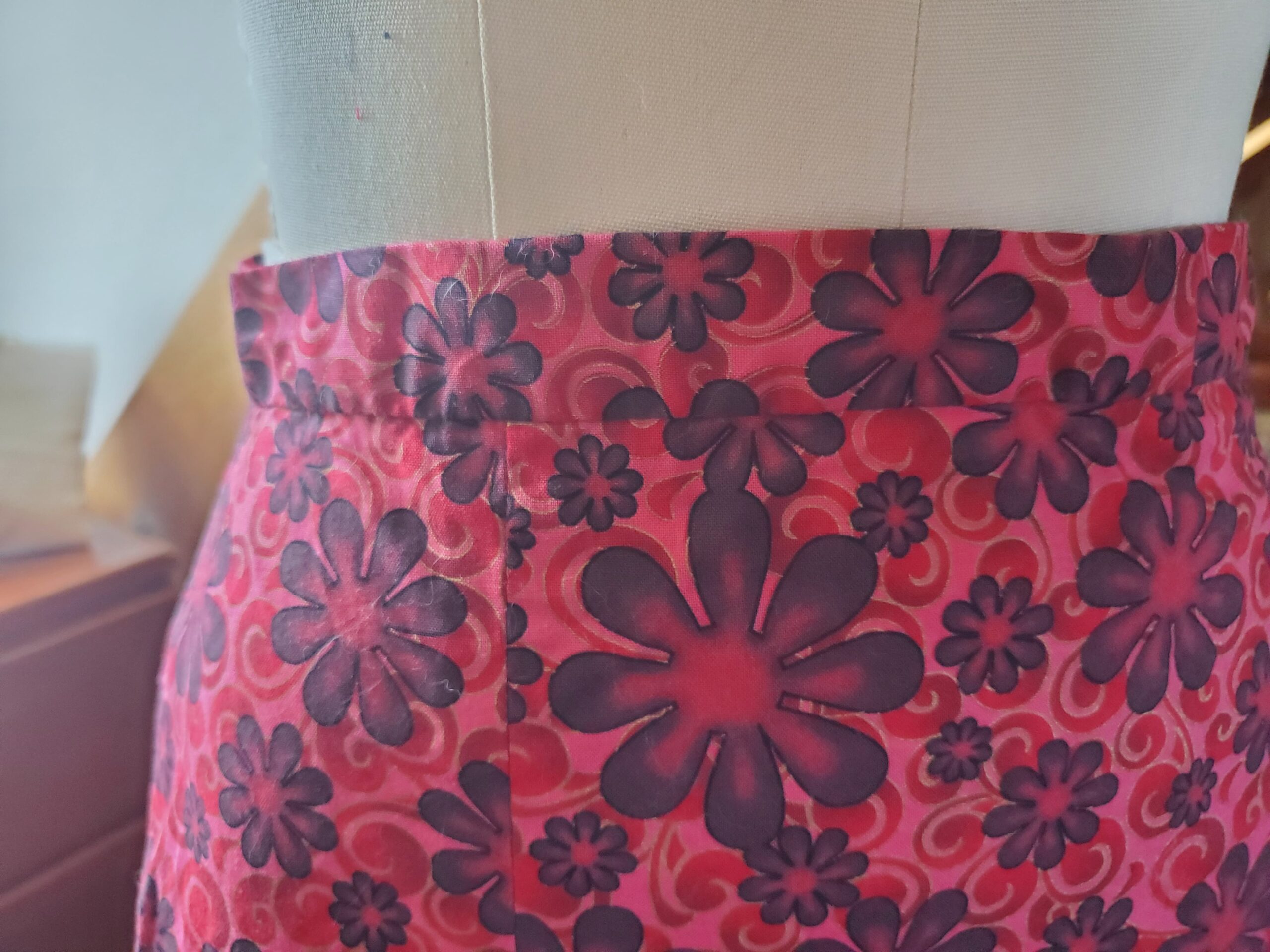 I found this beautiful pink‑and‑red floral material while thrifting and immediately knew it needed to become a 1960s‑inspired mini skirt—partly because of the bold pattern, and partly because the limited yardage practically demanded a smaller silhouette. The skirt is made from cotton and finished with a zipper and hook‑and‑eye closures at the waistband, keeping the construction simple and true to the era’s clean lines.
