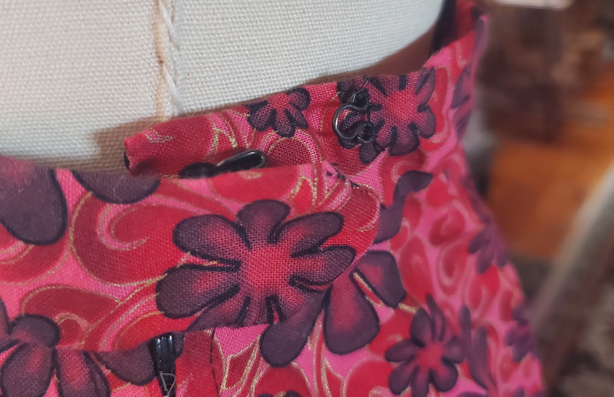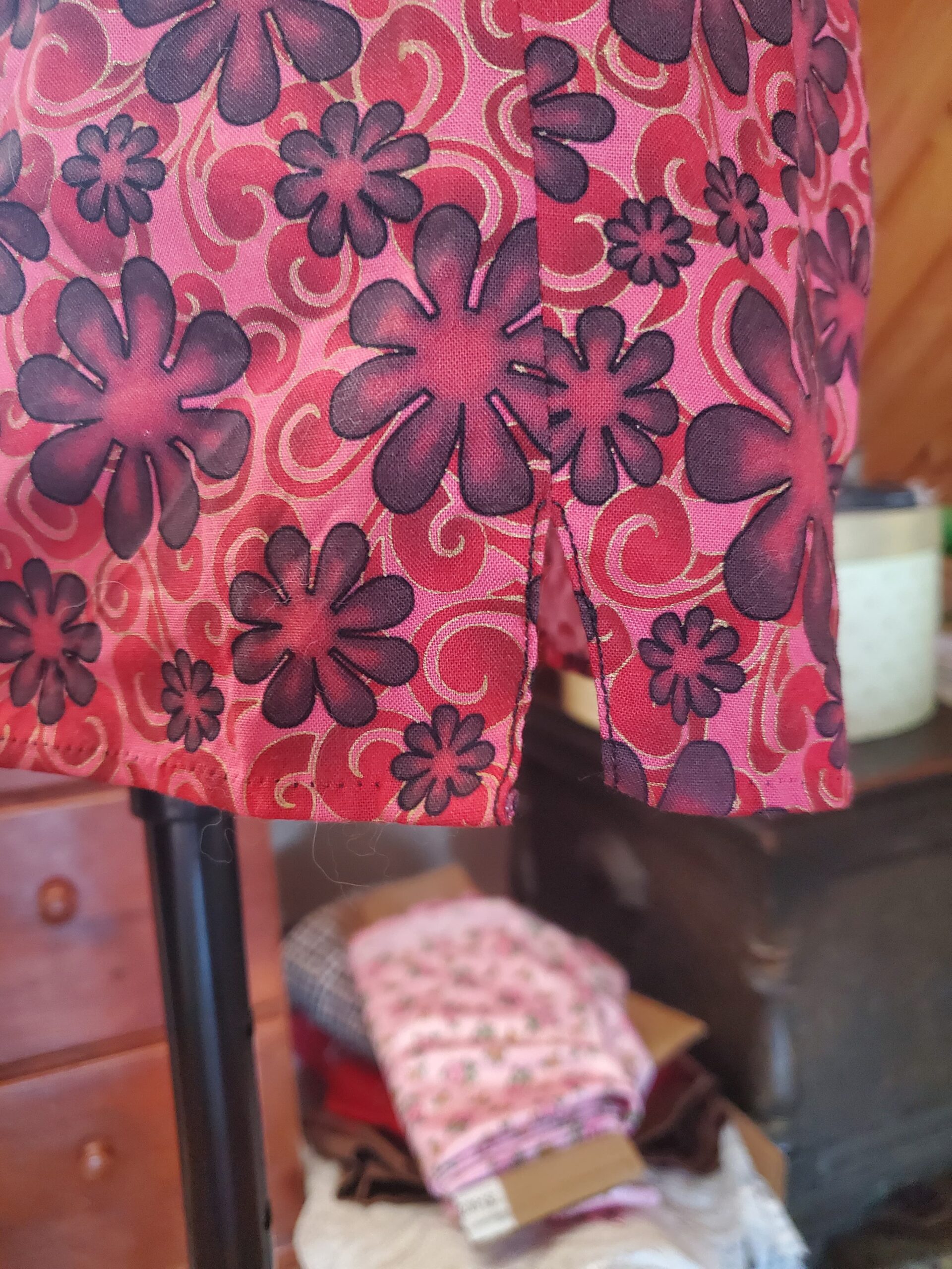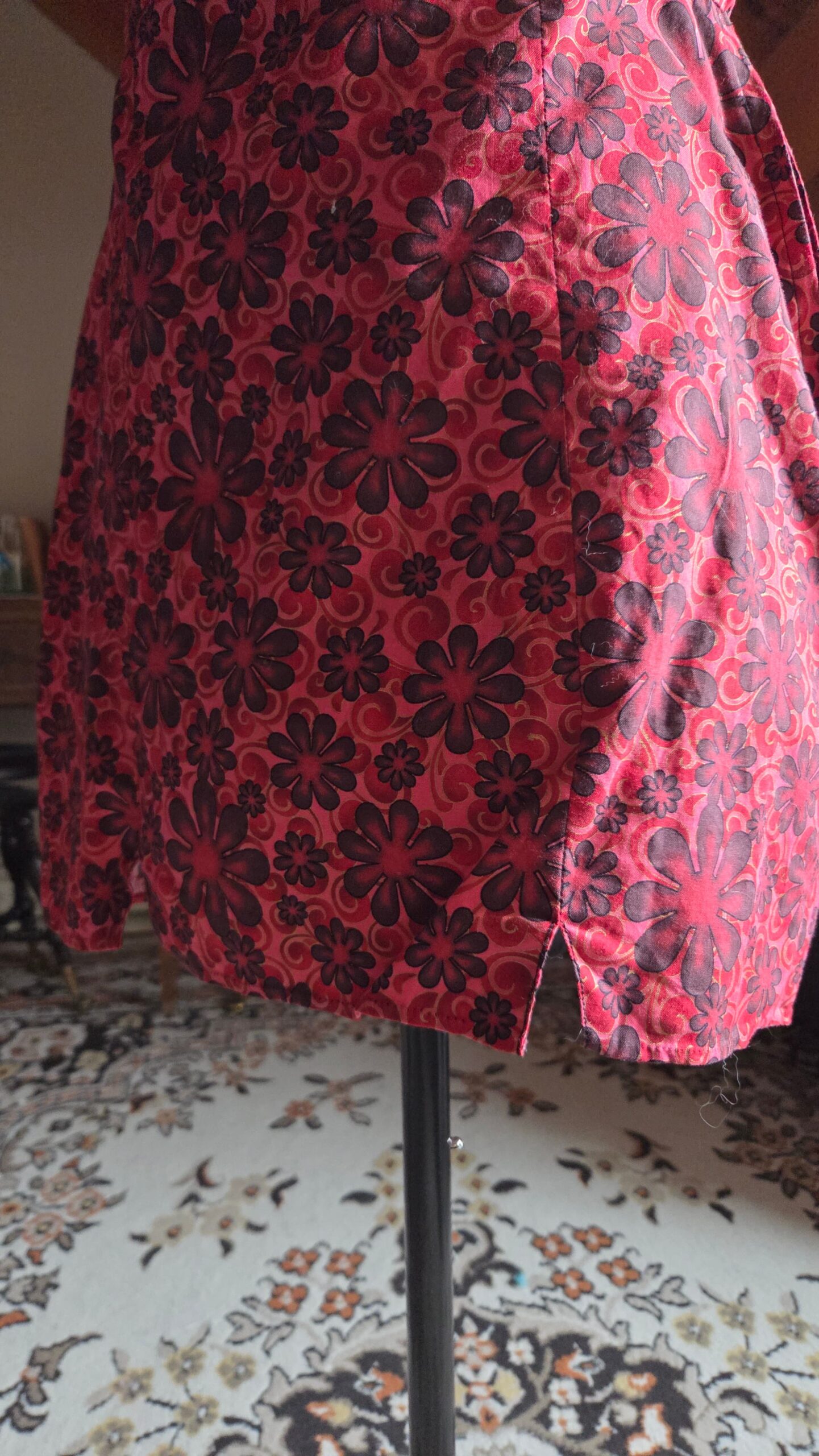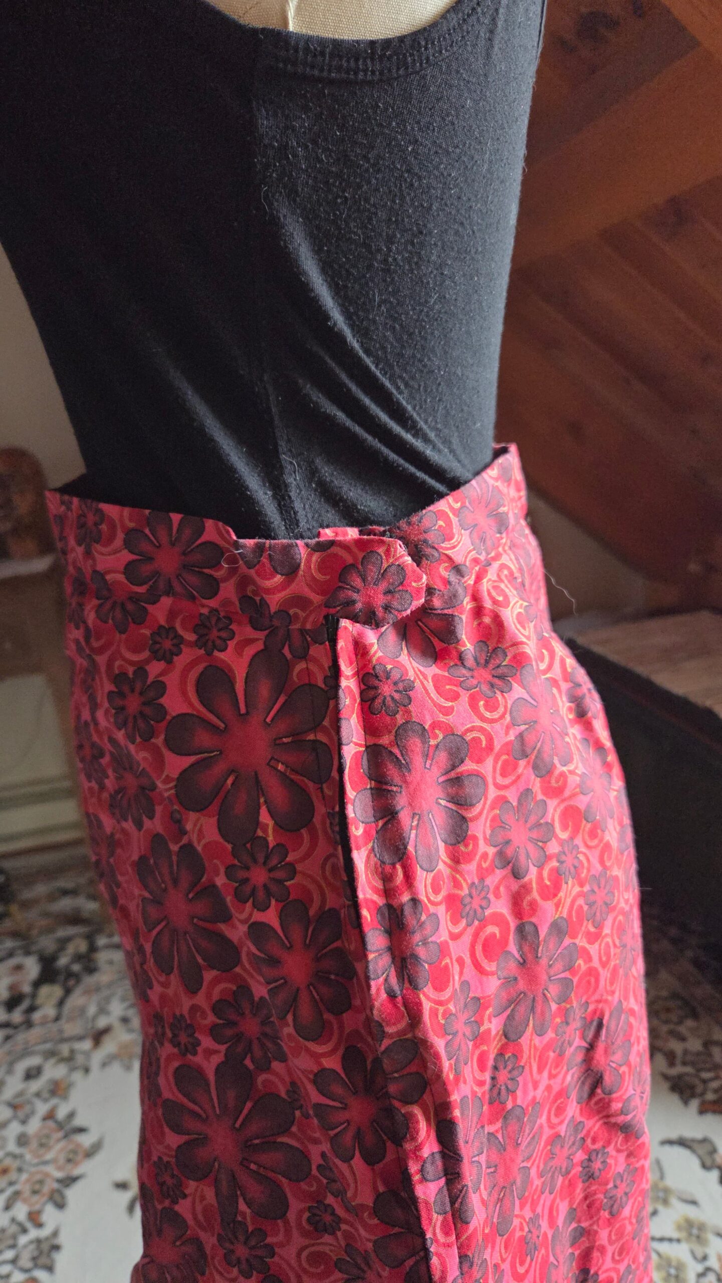 I found this beautiful pink‑and‑red floral material while thrifting and immediately knew it needed to become a 1960s‑inspired mini skirt—partly because of the bold pattern, and partly because the limited yardage practically demanded a smaller silhouette. The skirt is made from cotton and finished with a zipper and hook‑and‑eye closures at the waistband, keeping the construction simple and true to the era’s clean lines.