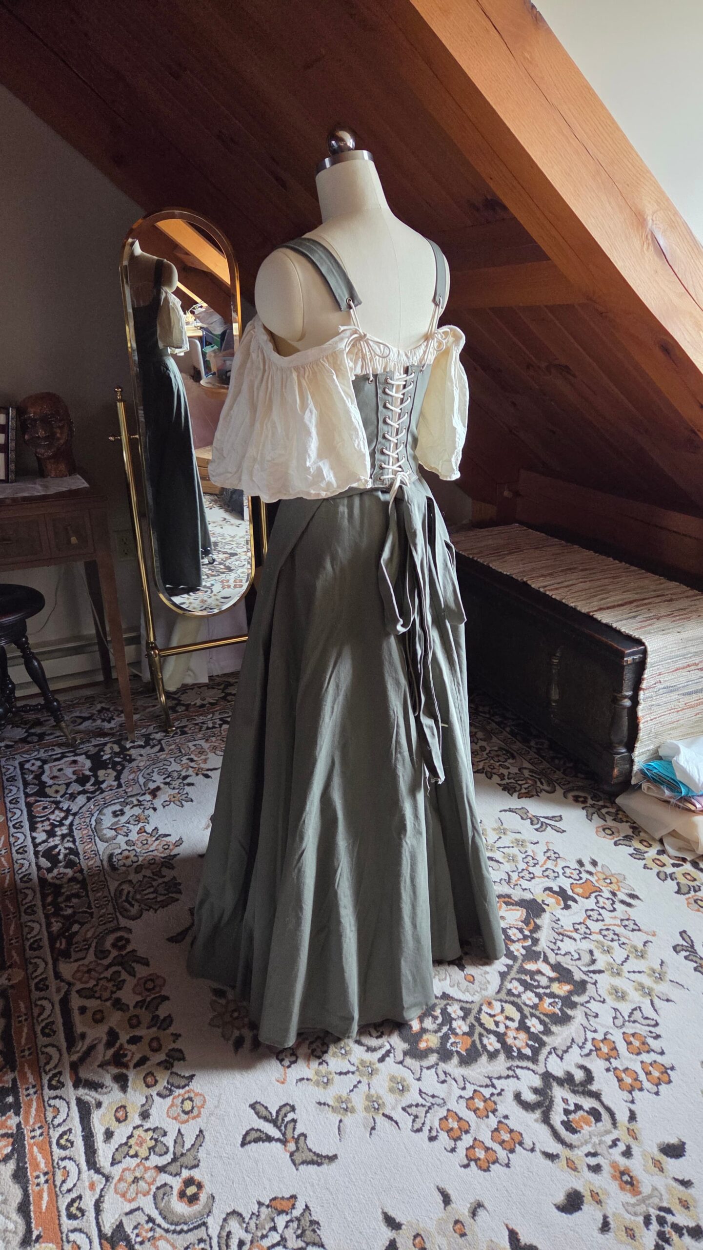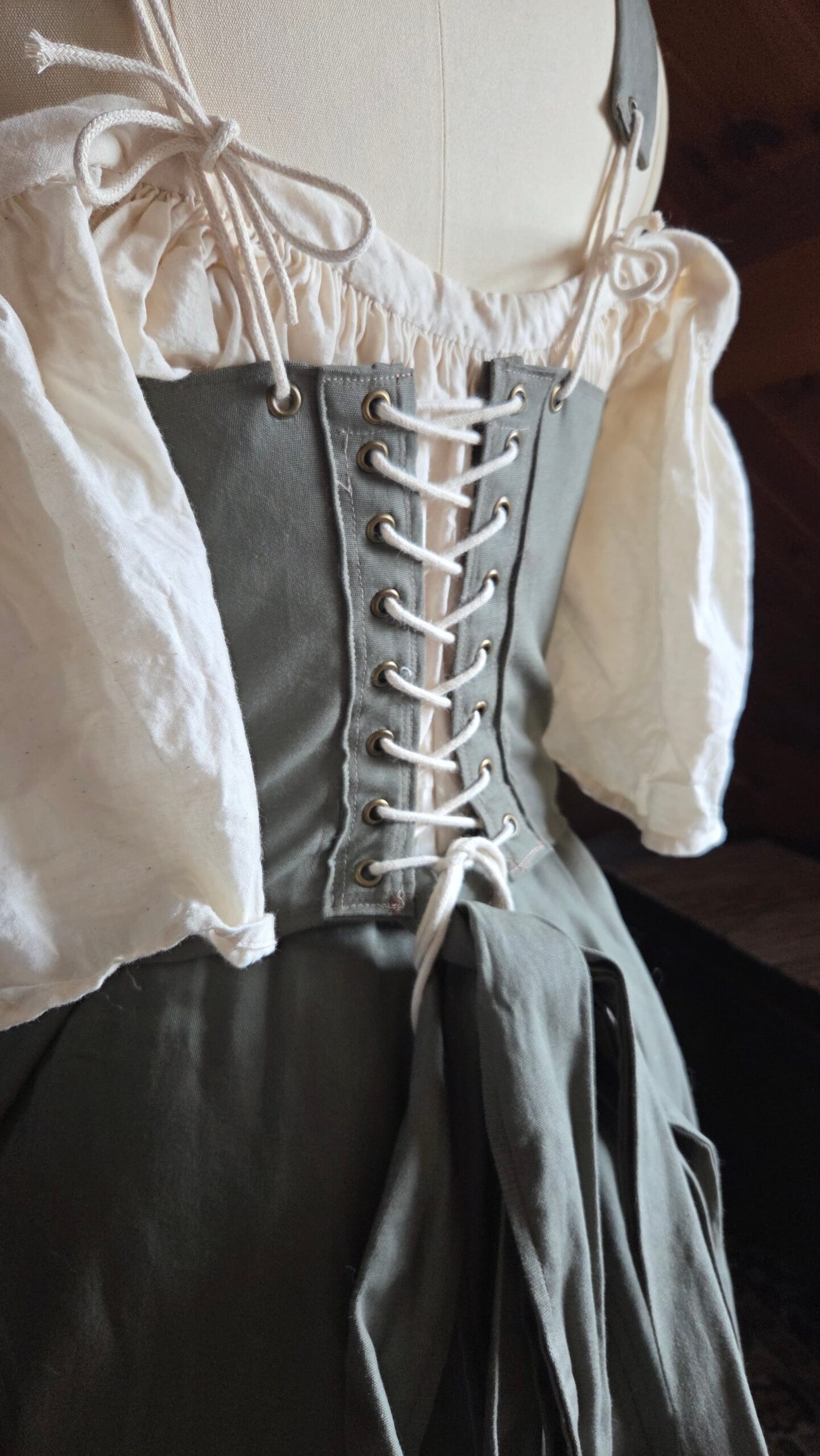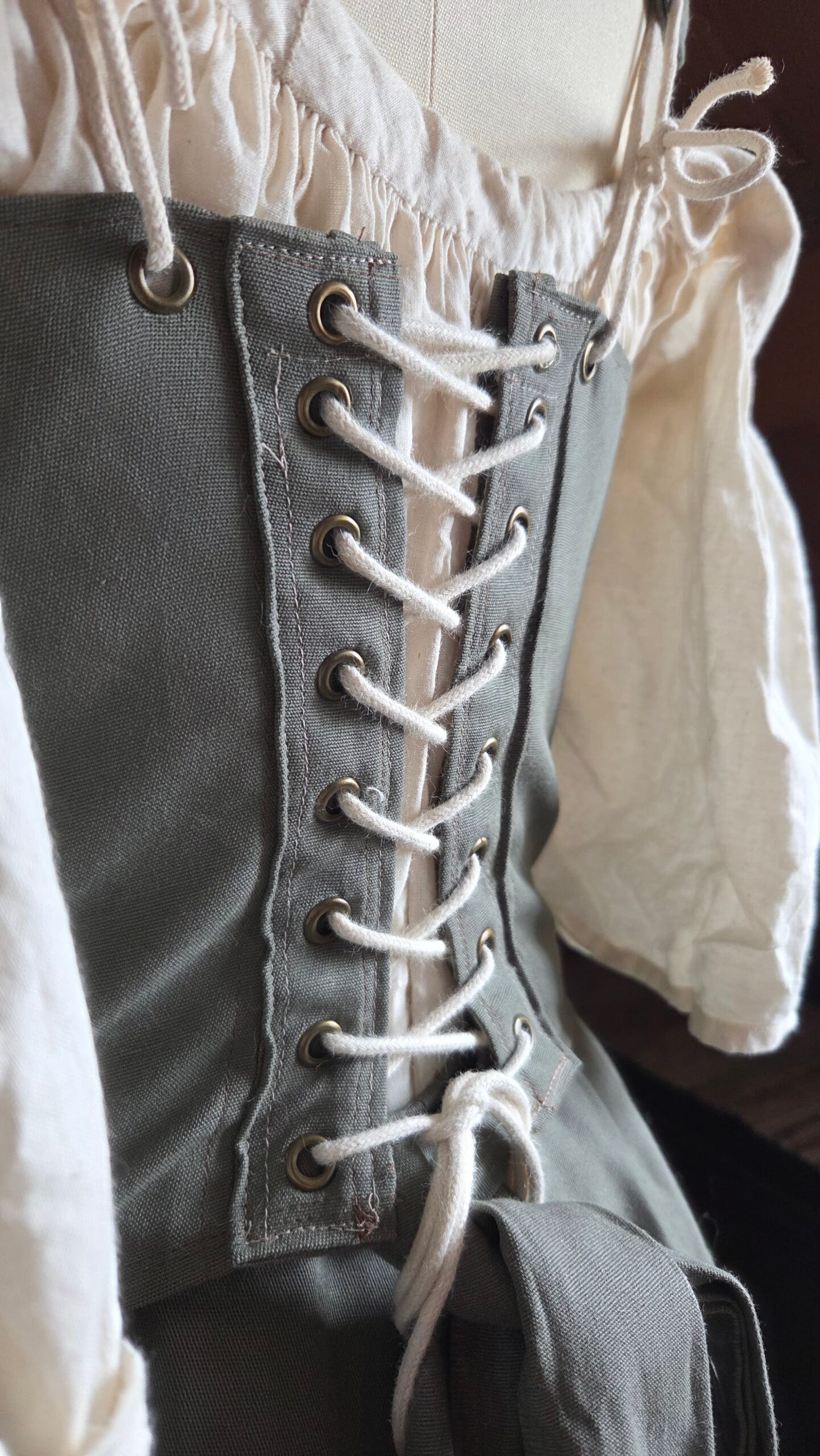 This top was loosely inspired by medieval peasant dresses and designed to pair with my floor‑length green skirt. Together, they create a complete costume ensemble that can be styled with a chemise or a billowy blouse for different looks. The piece is made from cotton and constructed with lacing, ribbon, and metal grommets.