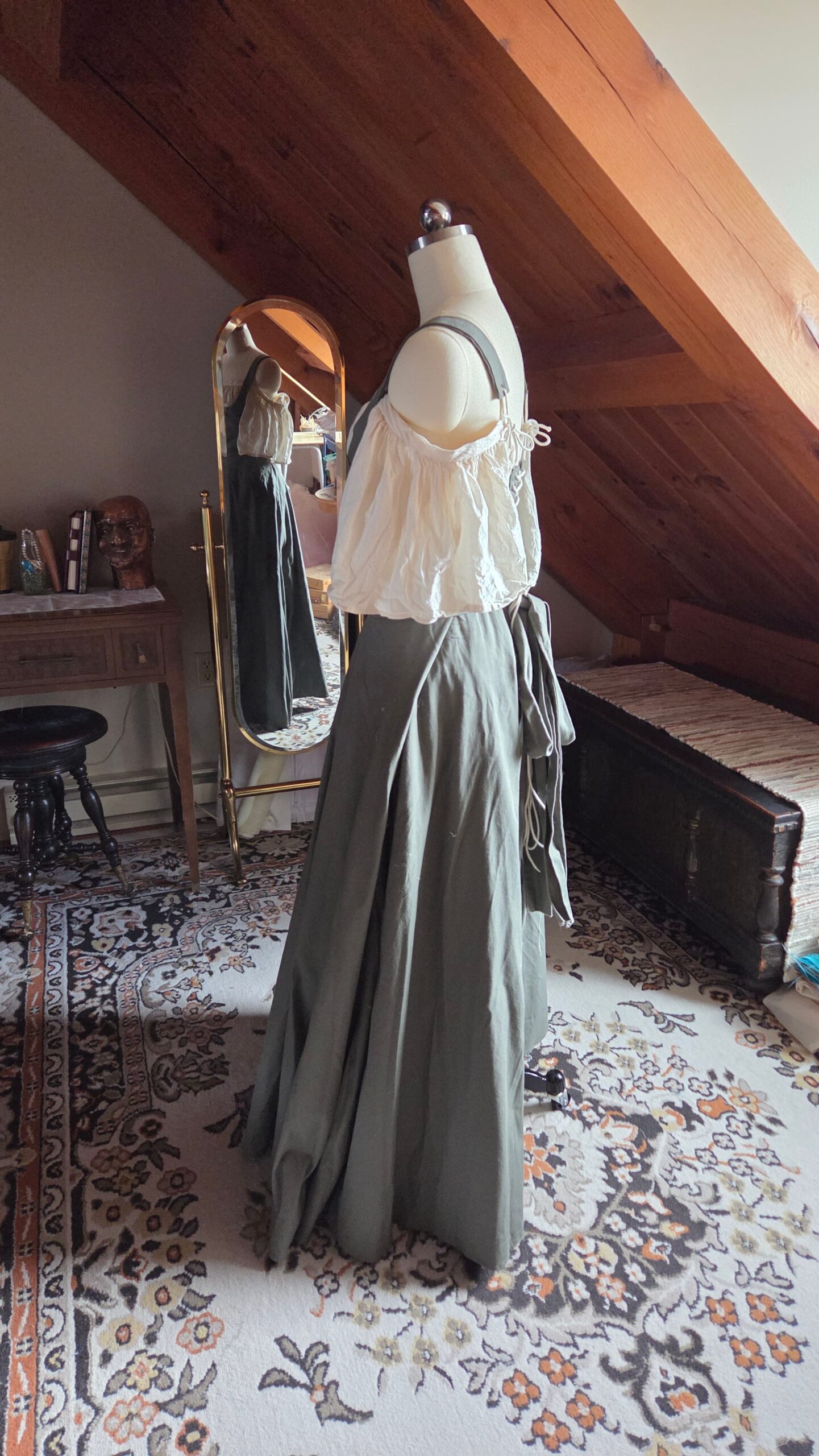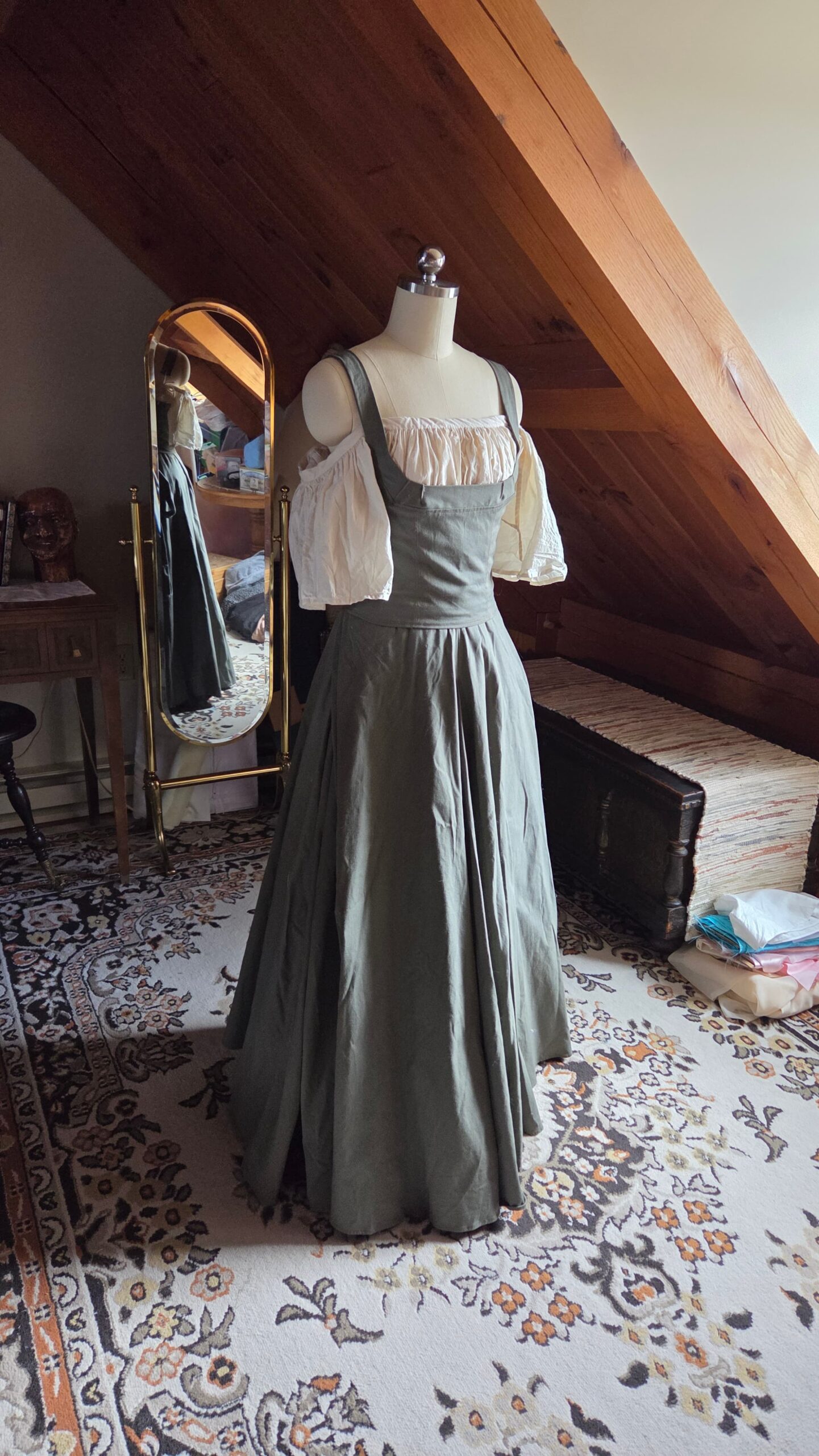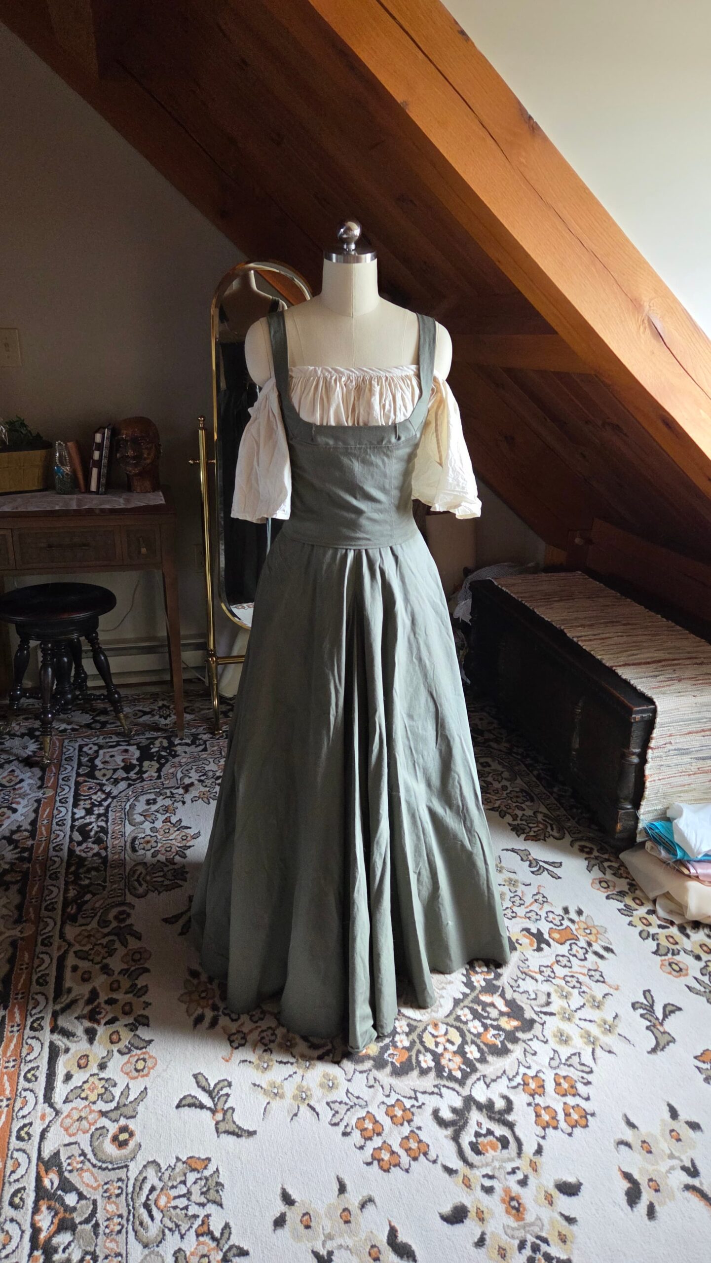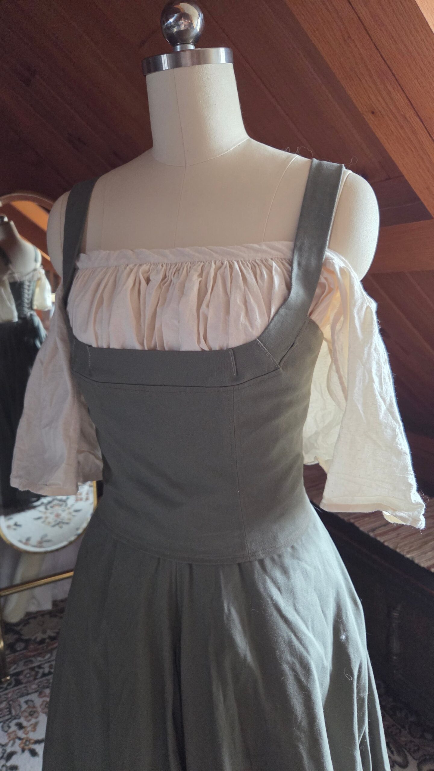 This top was loosely inspired by medieval peasant dresses and designed to pair with my floor‑length green skirt. Together, they create a complete costume ensemble that can be styled with a chemise or a billowy blouse for different looks. The piece is made from cotton and constructed with lacing, ribbon, and metal grommets.
