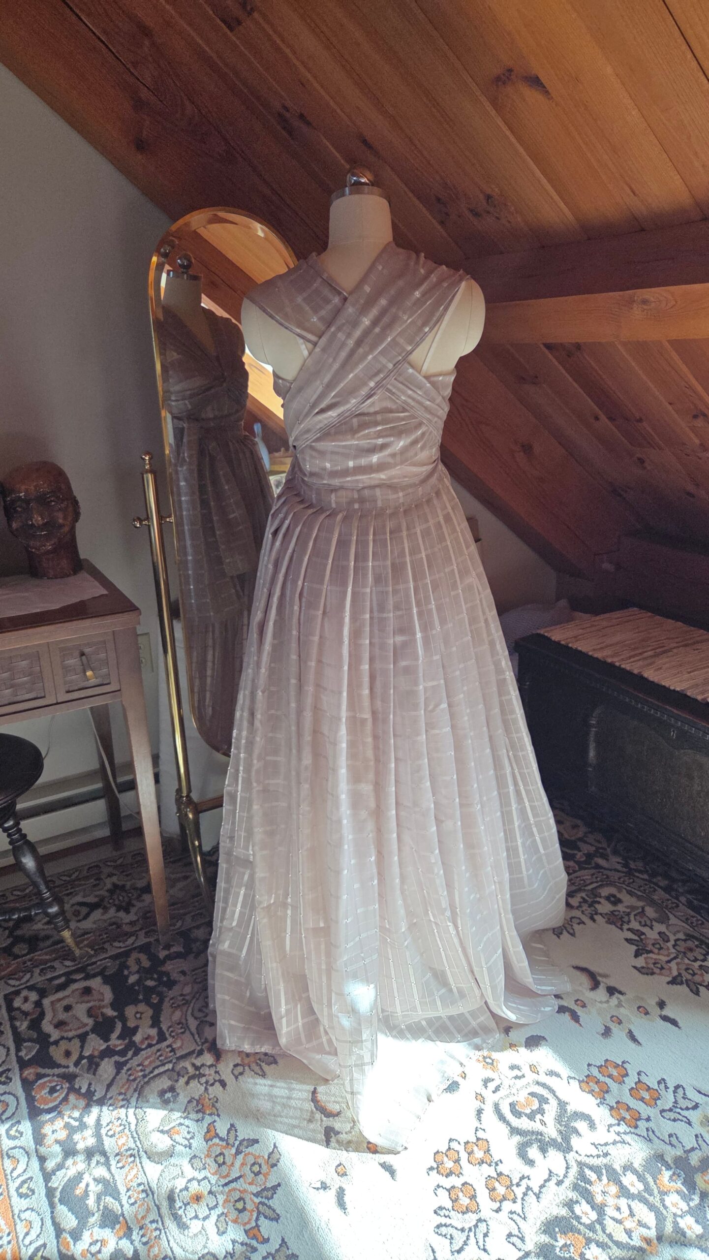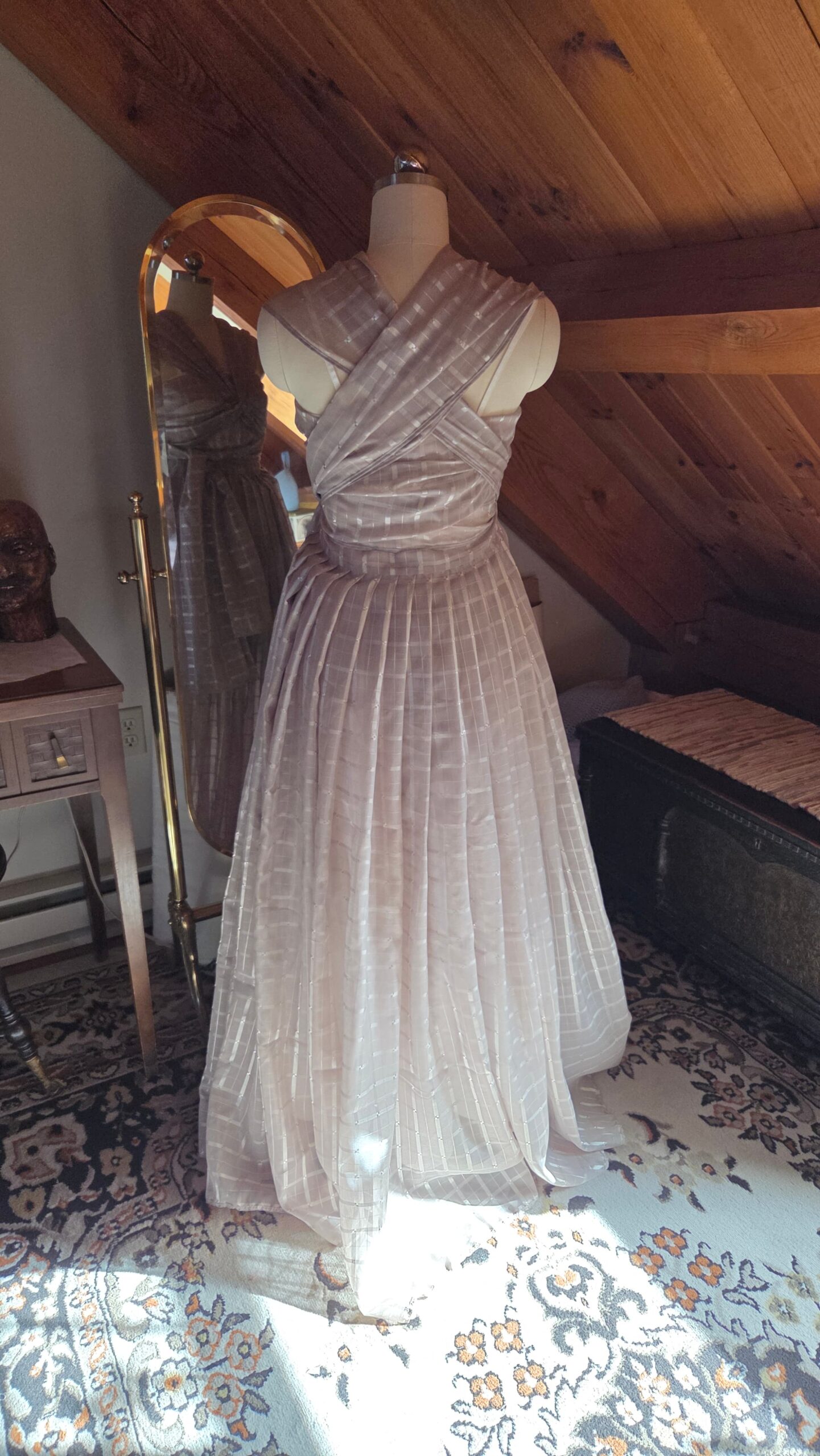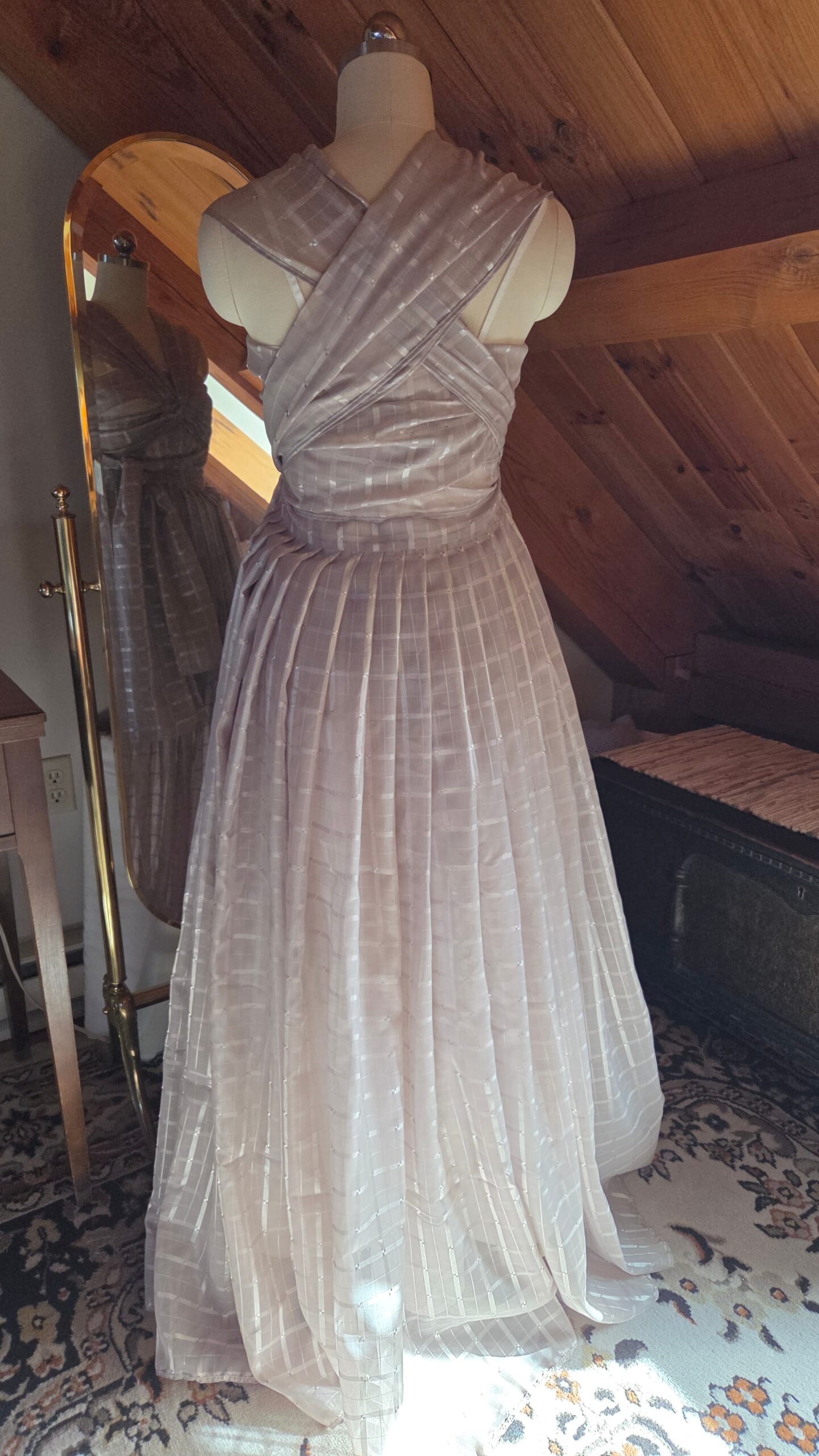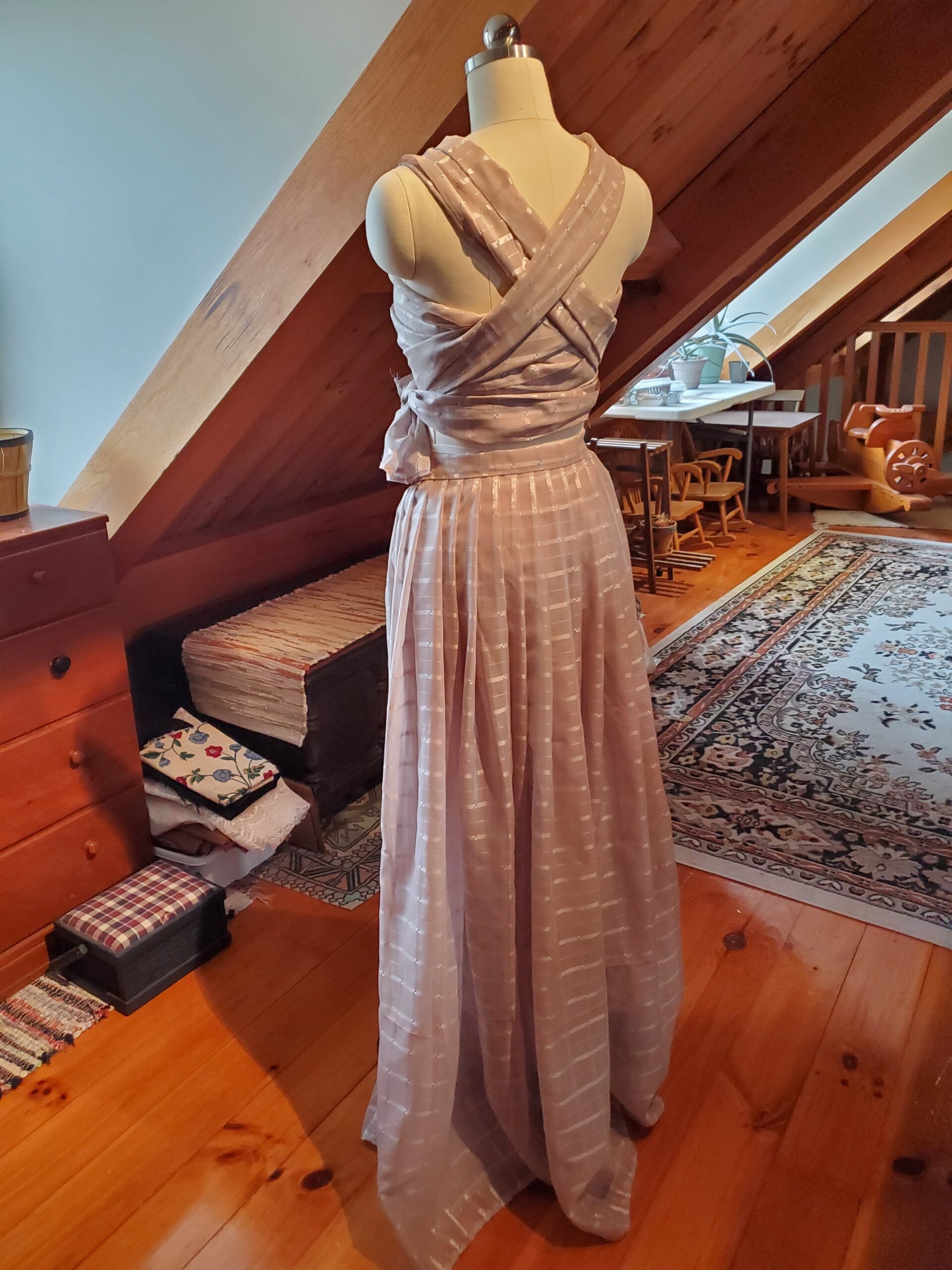 With nothing but the material and a dream, this dress came to life one step at a time—without a pattern. It was my first fully draped garment, shaped directly on the dress form. I began with the skirt, pleating the entire length of fabric down to my waist measurement and securing it with a hook‑and‑eye closure. The excess fabric trimmed from the hem was then finished and transformed into the bodice, allowing the top to grow organically from what remained.