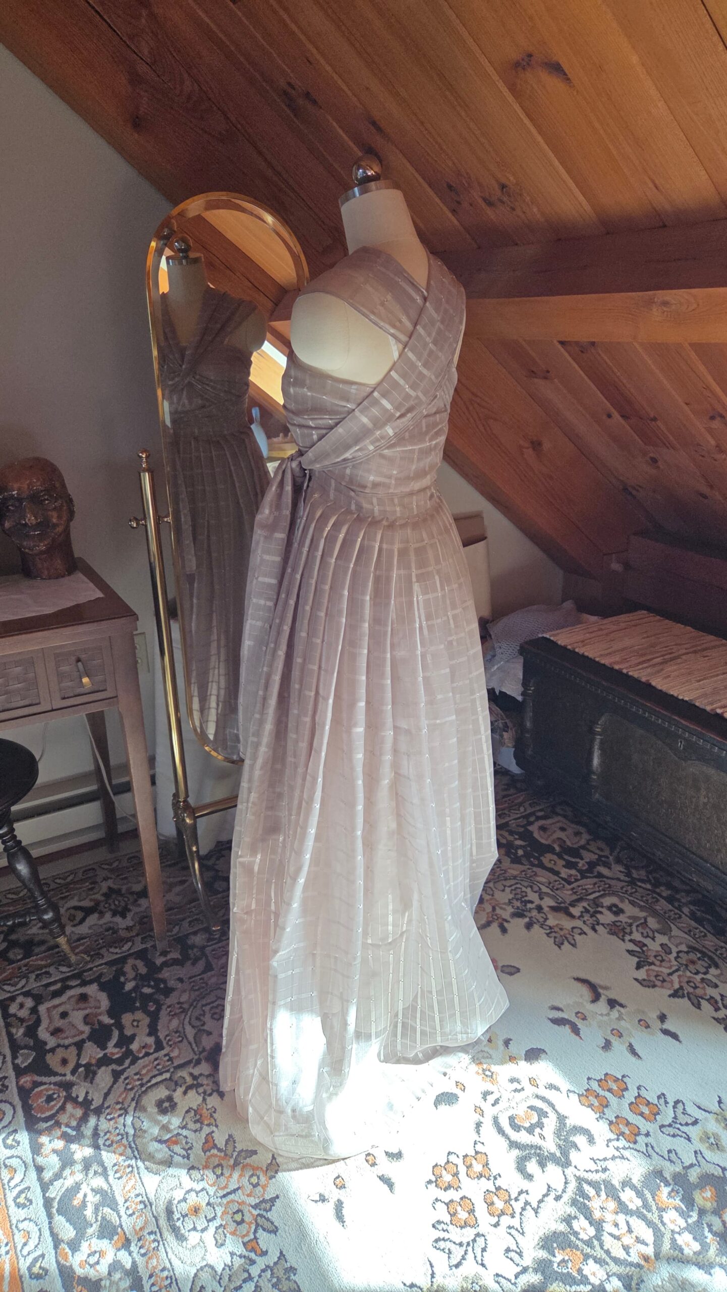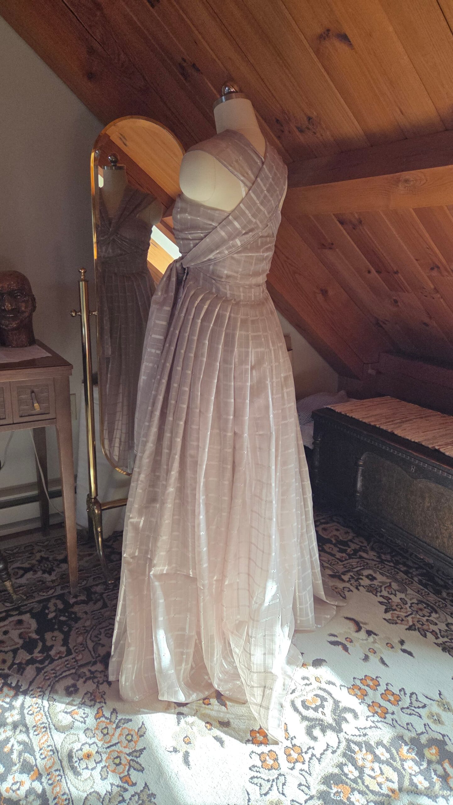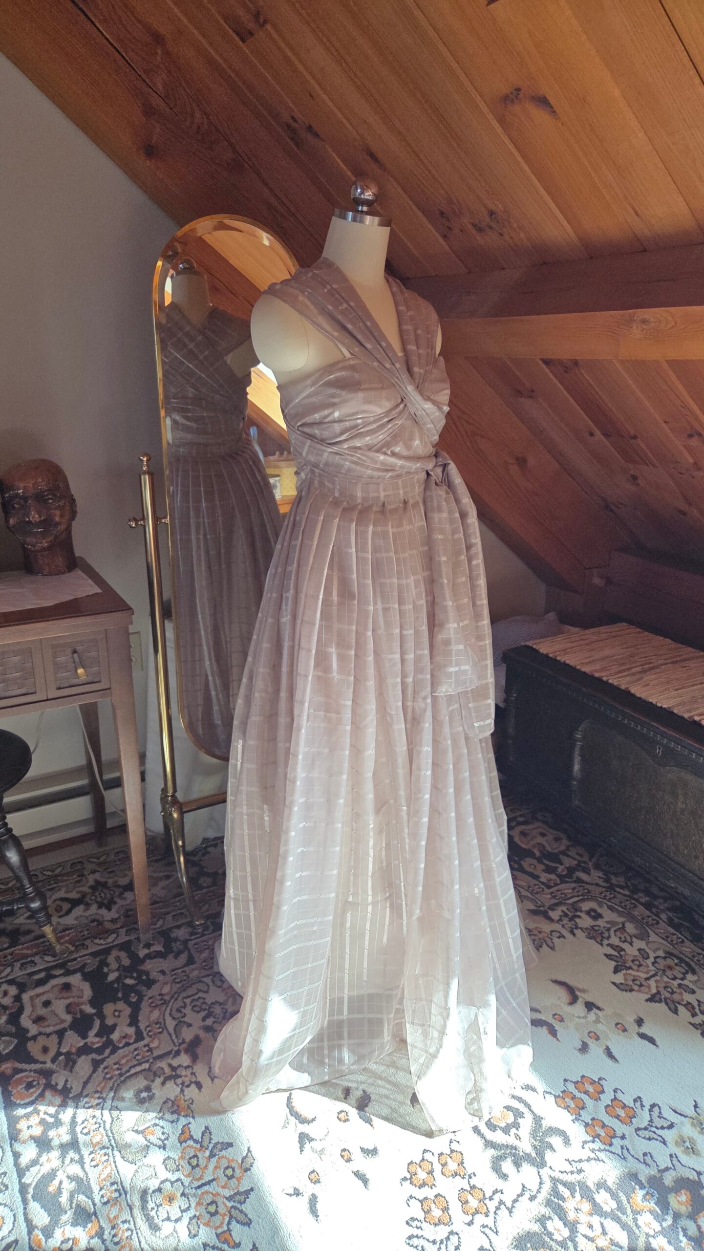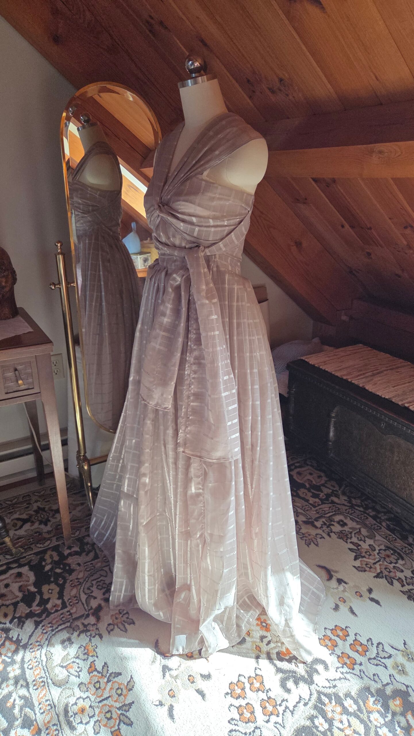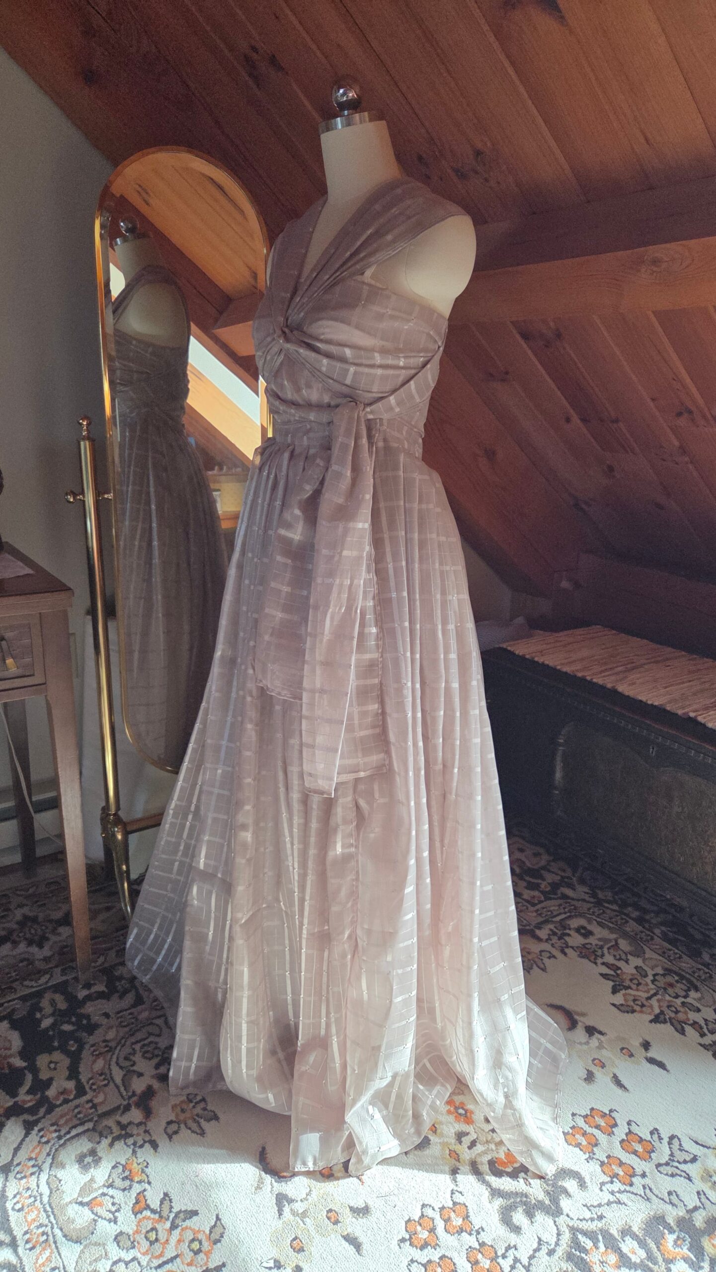 With nothing but the material and a dream, this dress came to life one step at a time—without a pattern. It was my first fully draped garment, shaped directly on the dress form. I began with the skirt, pleating the entire length of fabric down to my waist measurement and securing it with a hook‑and‑eye closure. The excess fabric trimmed from the hem was then finished and transformed into the bodice, allowing the top to grow organically from what remained.