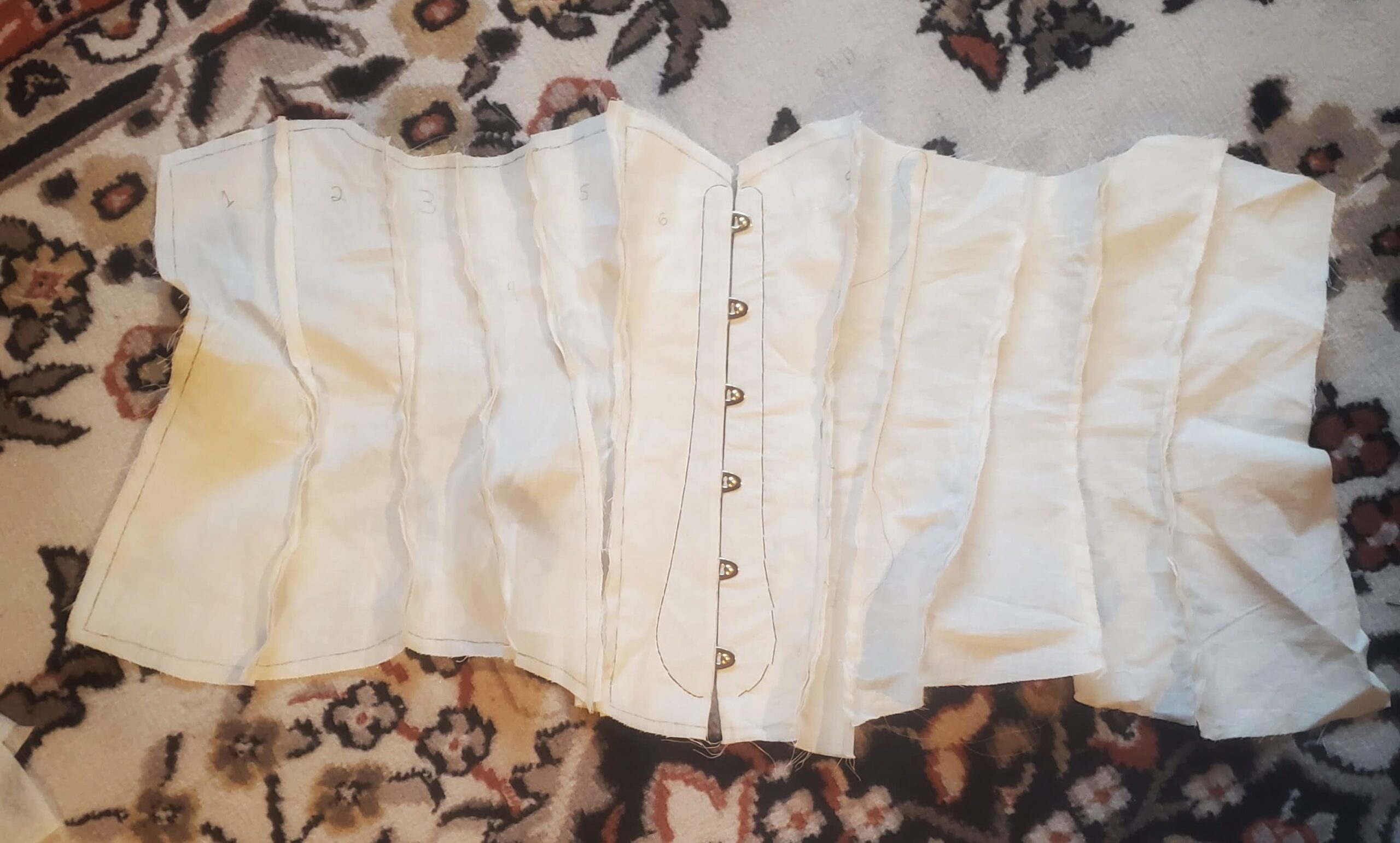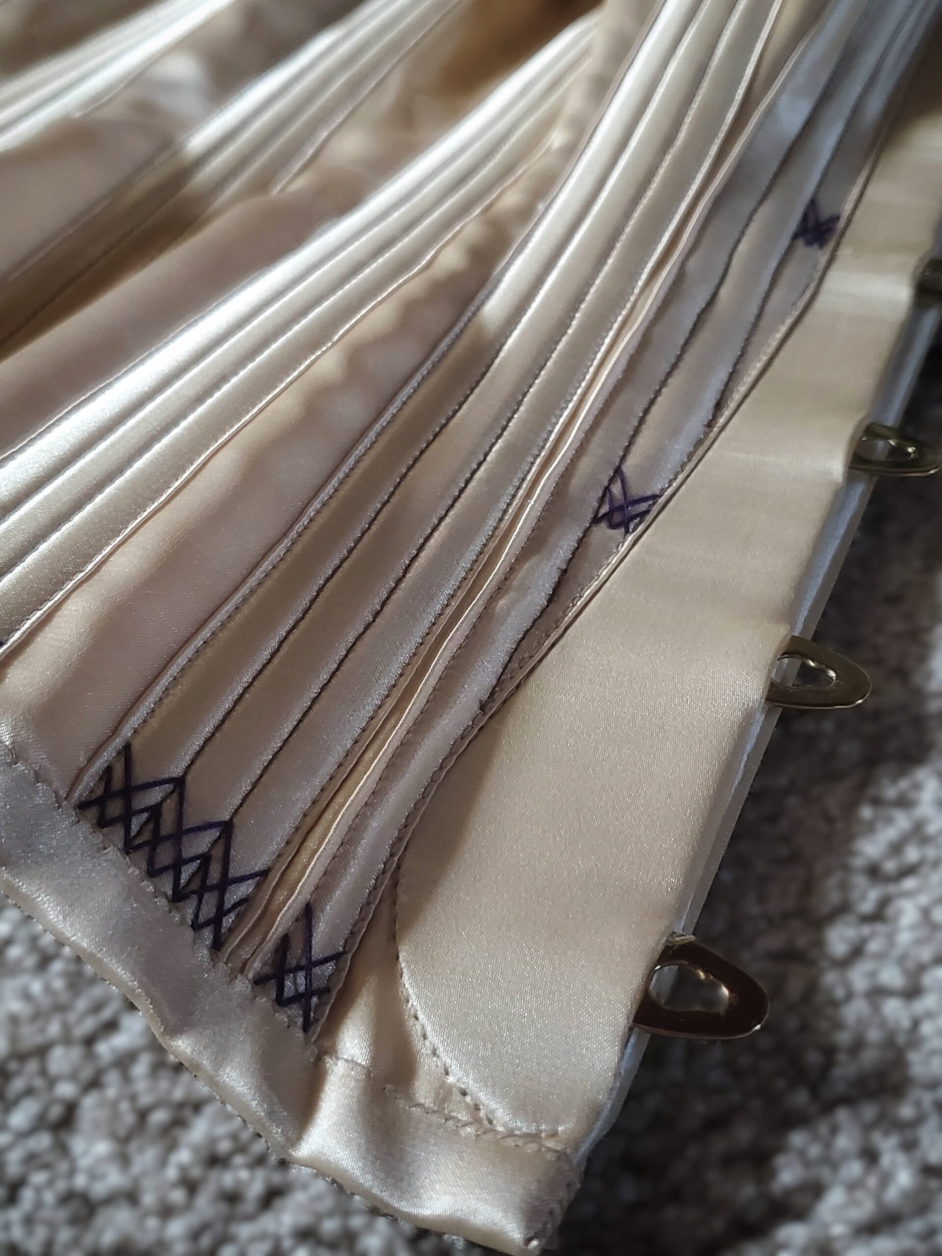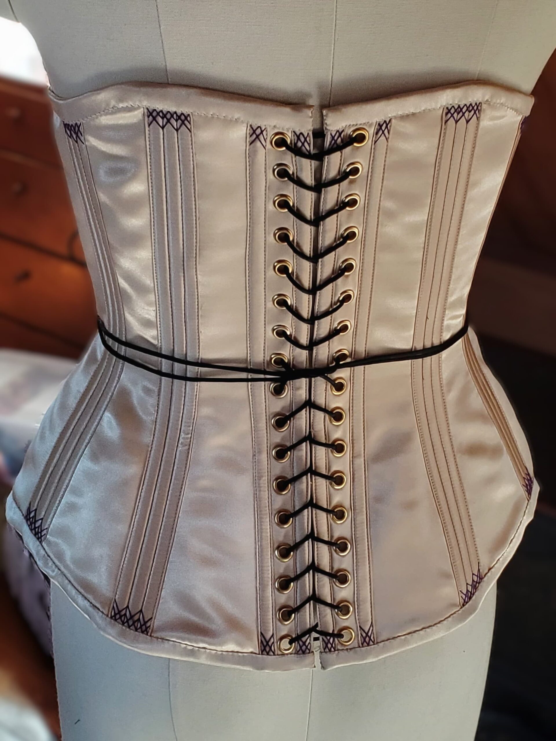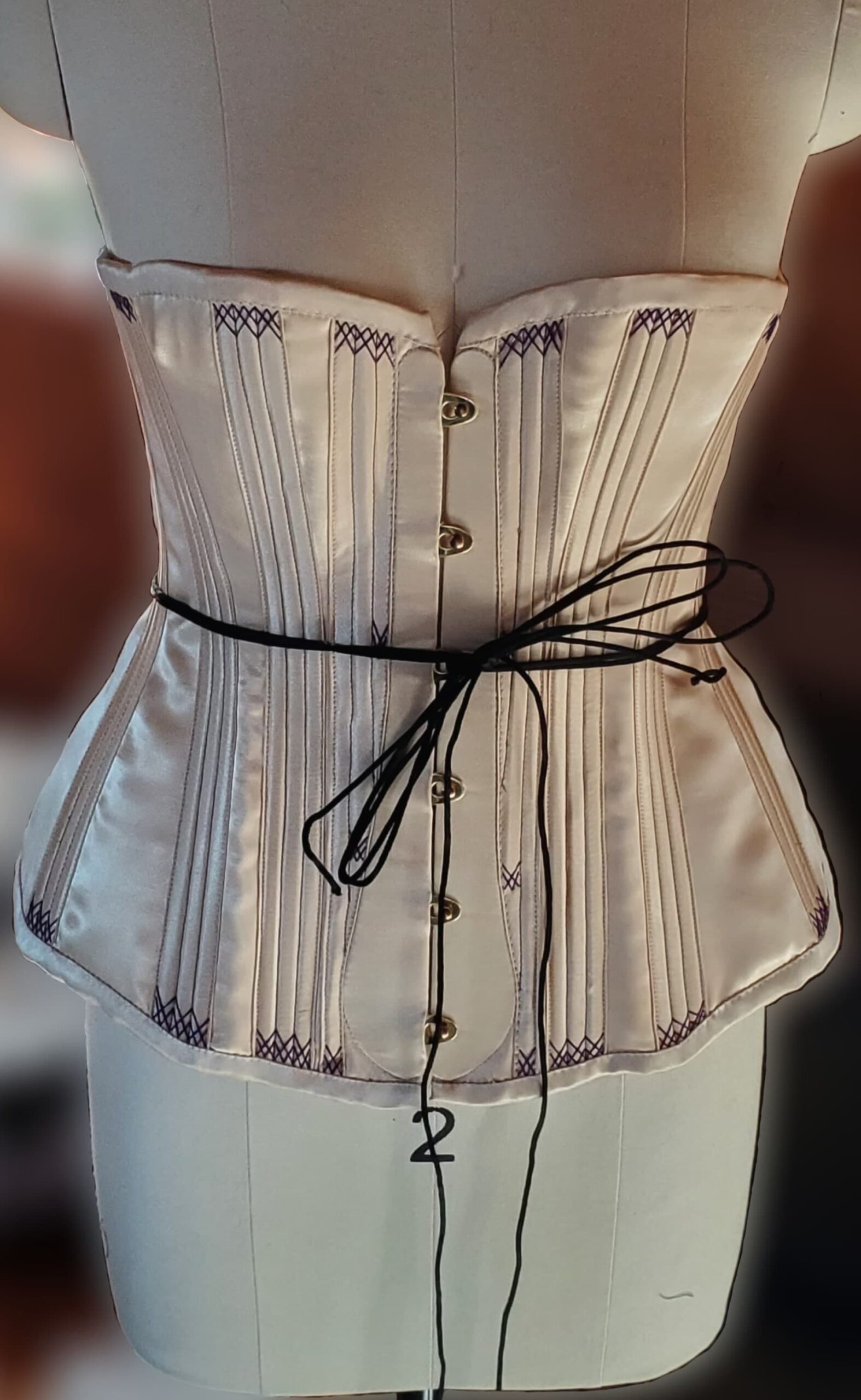 This 1890s corset was my third attempt at corsetry and my first serious step toward historical accuracy. I drafted the pattern to my own measurements using Stays and Corsets by Mandy Barrington, and I plan to use this piece as the foundation for many future garments inspired by this era. It’s constructed from silk and cotton coutil, reinforced with a 12‑inch metal spoon busk, plastic boning, metal grommets, traditional lacing, and finished with hand‑worked embroidery.