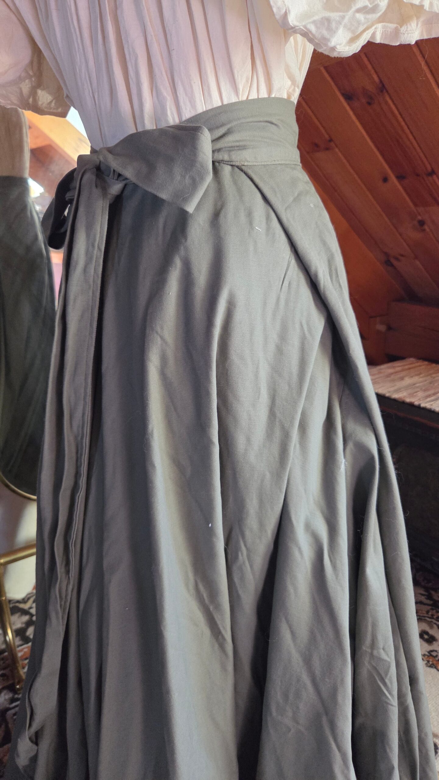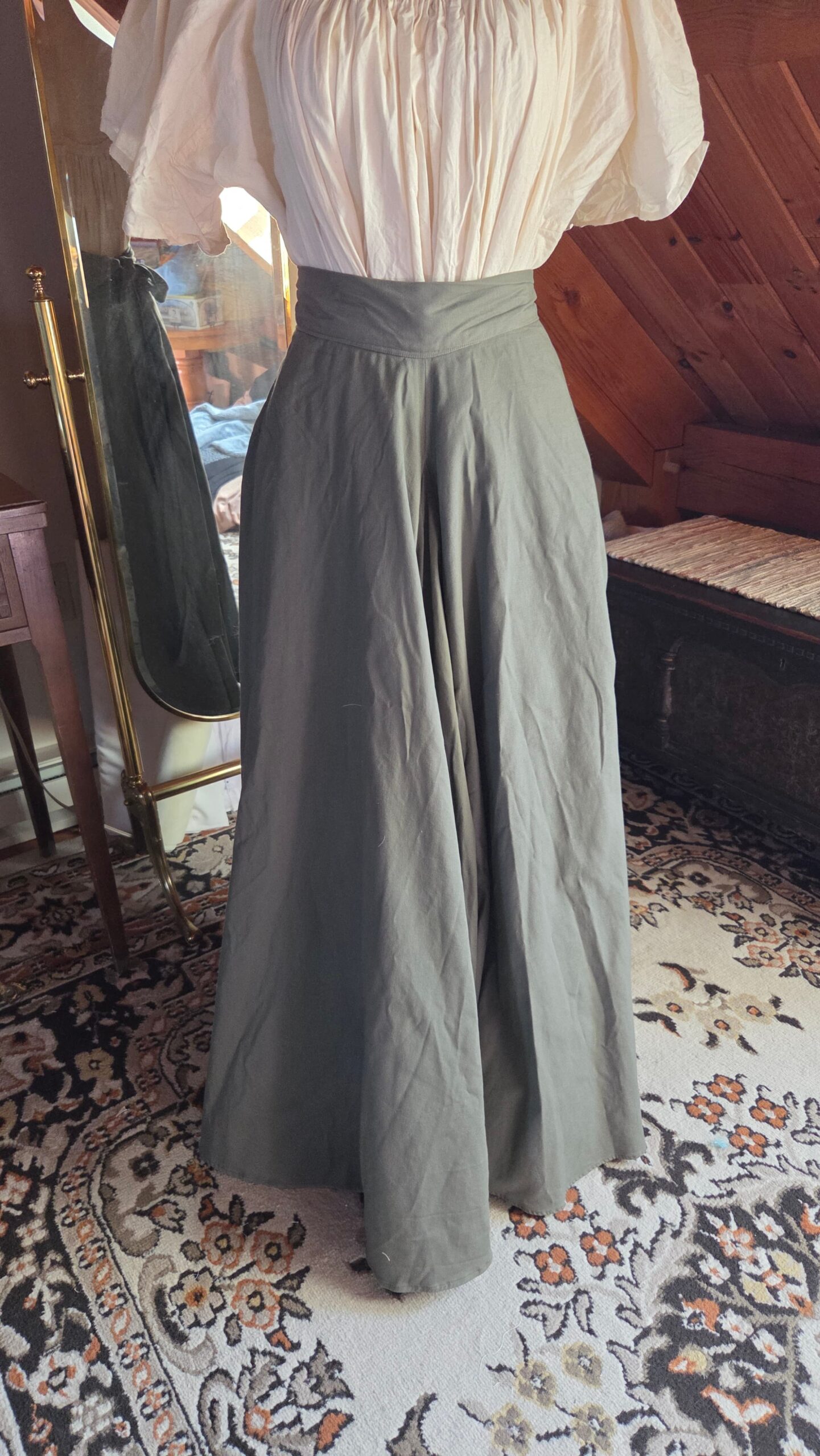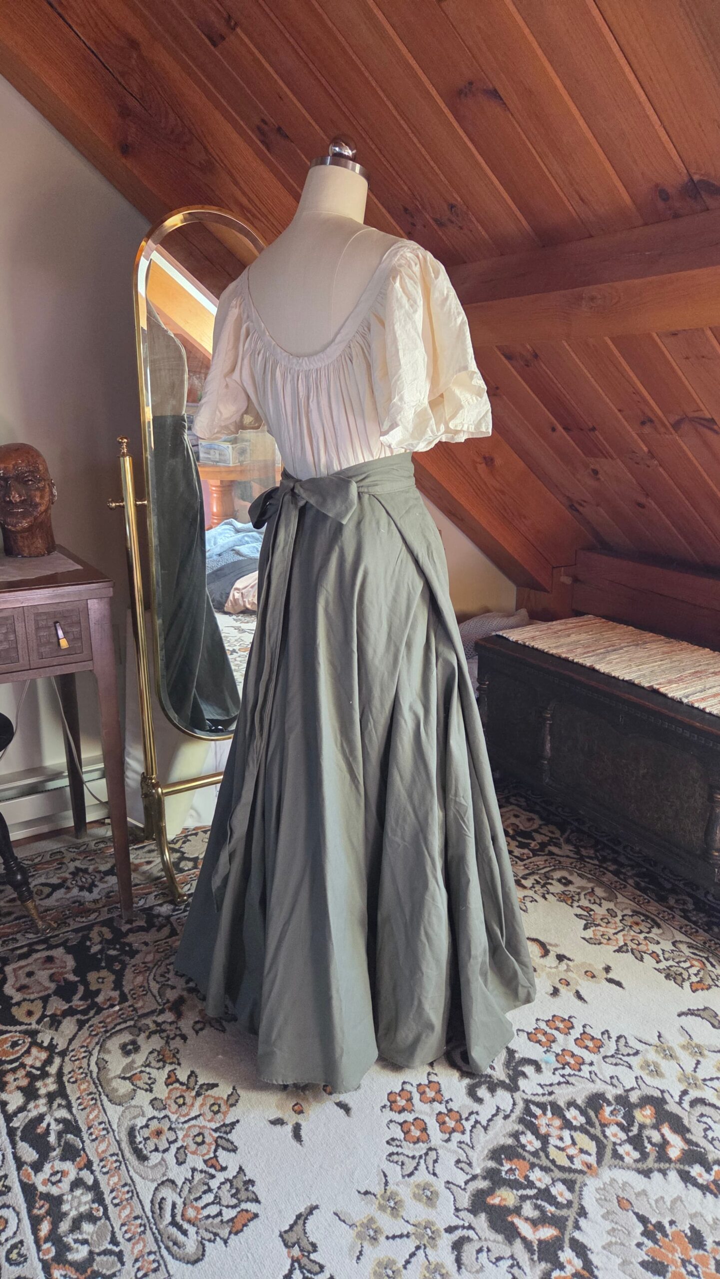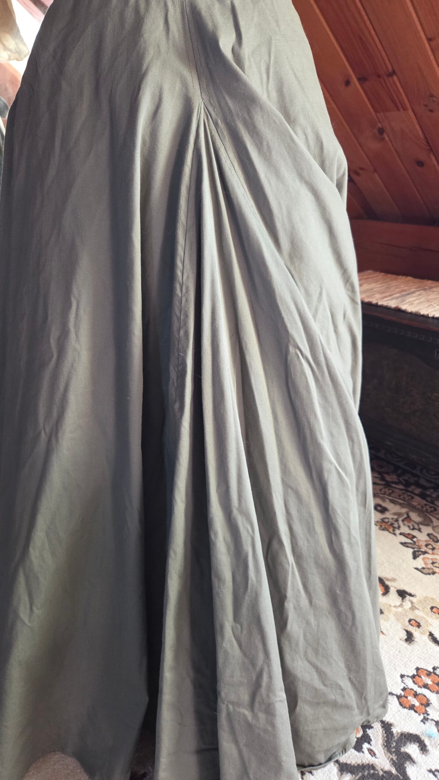Loosely inspired by Victorian walking skirts, this project began with a simple circle‑skirt pattern transformed into a full, floor‑length silhouette. I incorporated construction methods seen throughout historical garments, including adjustable tie closures at the waist. The waistband ties at both the front and back, making the fit fully customizable and leaving ample room for 18th‑century pockets. The skirt is made from nine yards of heavy cotton, giving it a beautiful weight and movement reminiscent of period walking skirts.