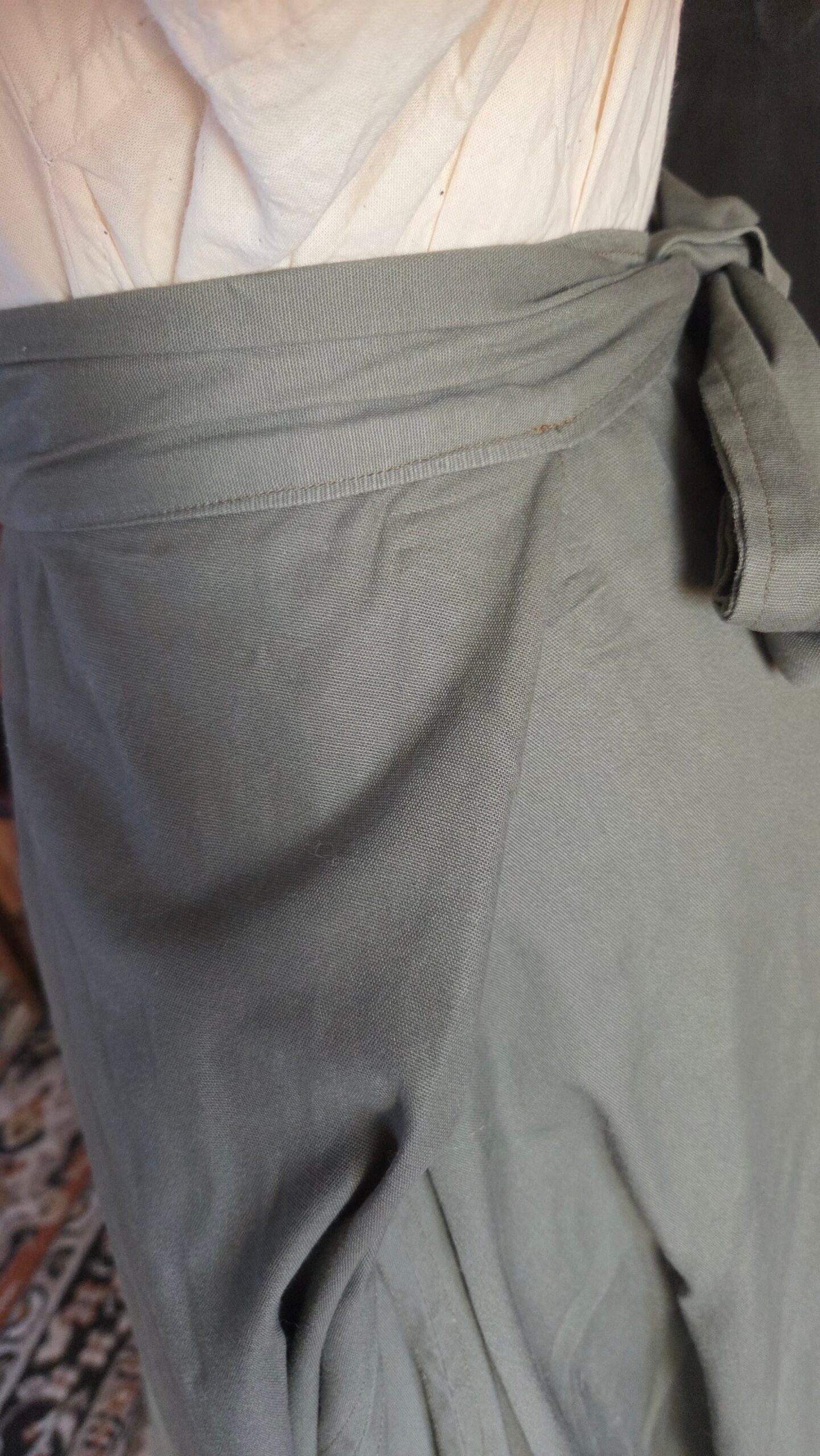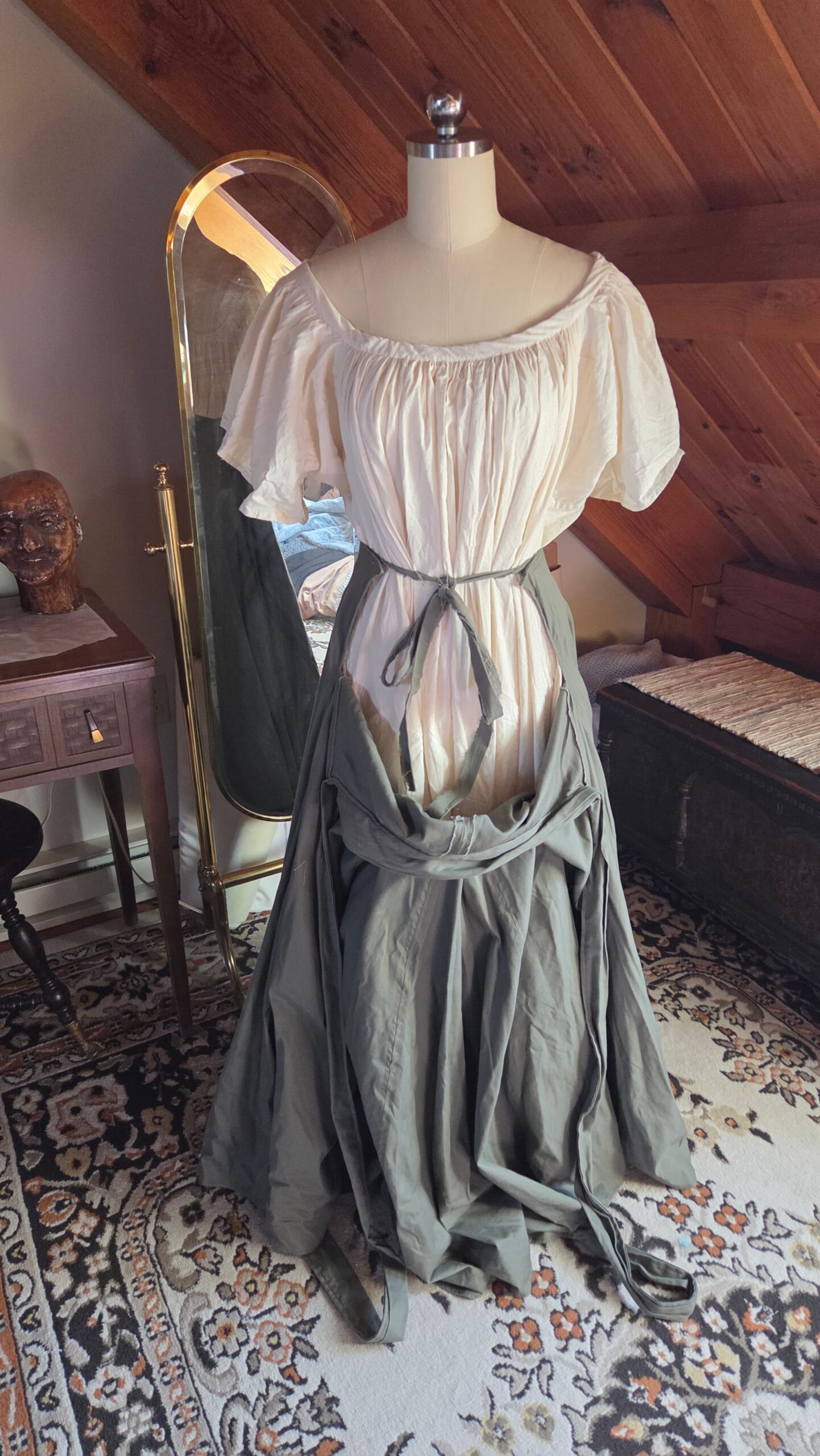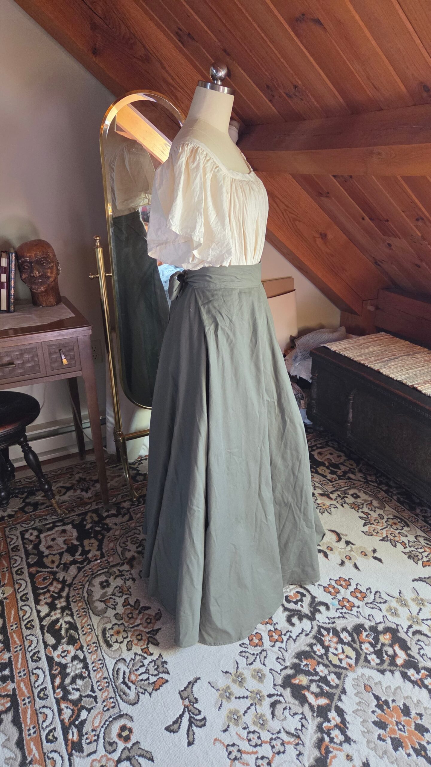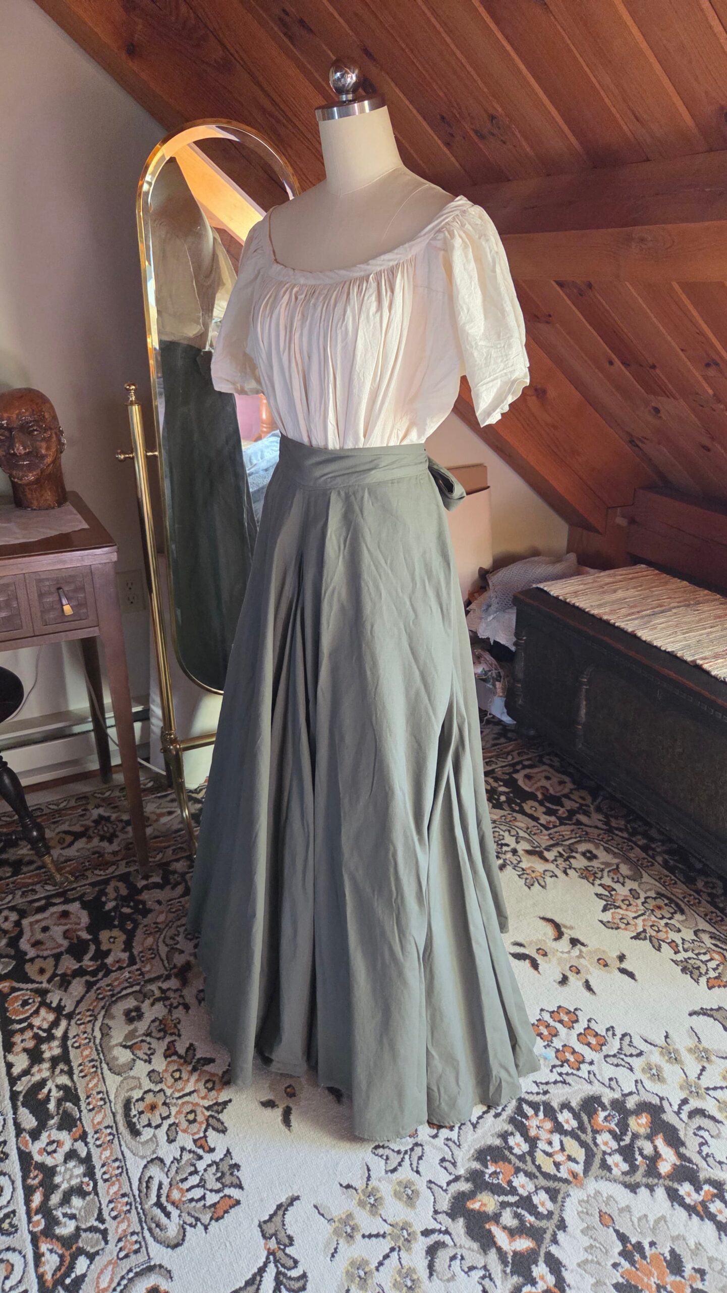 Loosely inspired by Victorian walking skirts, this project began with a simple circle‑skirt pattern transformed into a full, floor‑length silhouette. I incorporated construction methods seen throughout historical garments, including adjustable tie closures at the waist. The waistband ties at both the front and back, making the fit fully customizable and leaving ample room for 18th‑century pockets. The skirt is made from nine yards of heavy cotton, giving it a beautiful weight and movement reminiscent of period walking skirts.