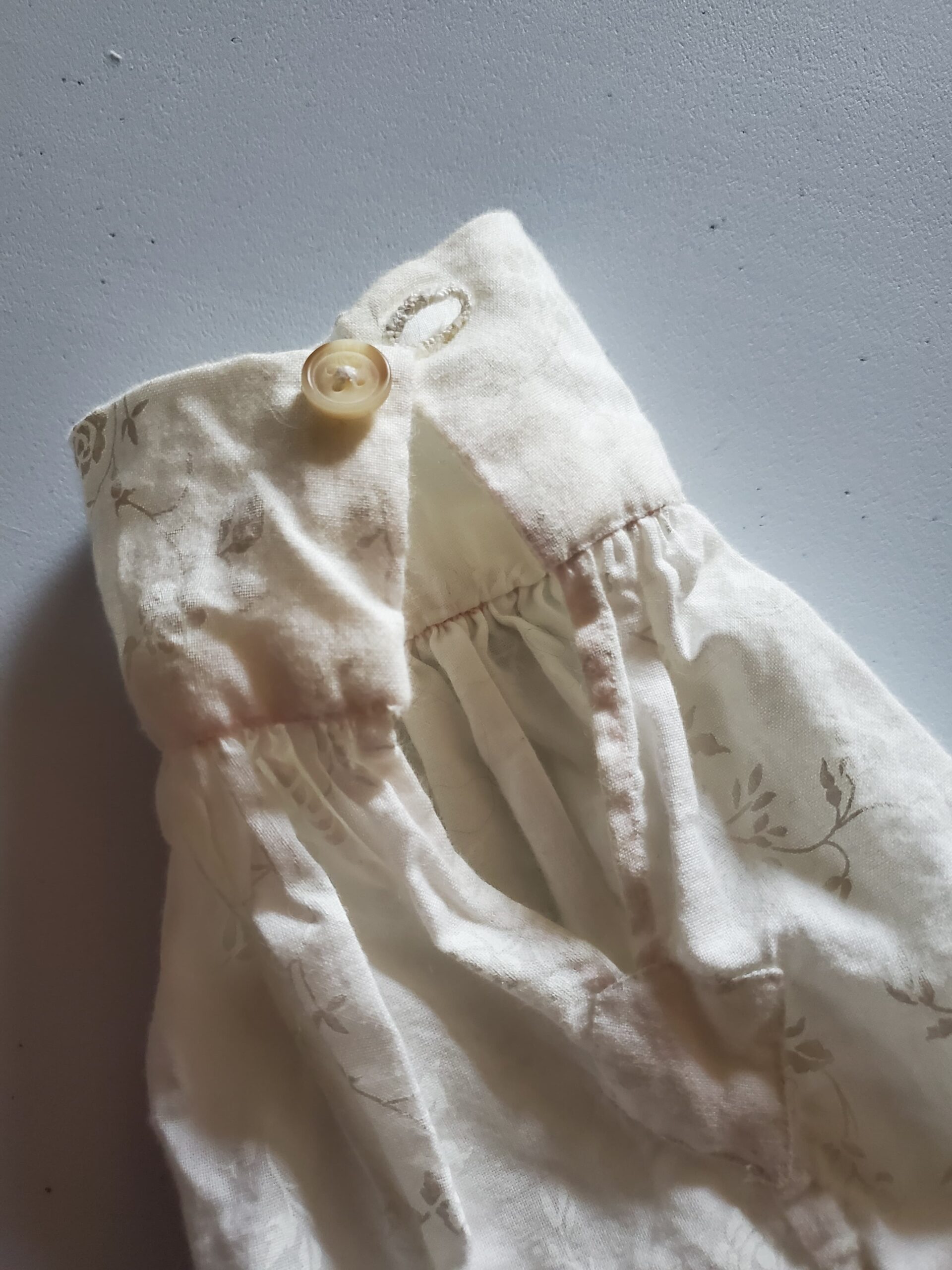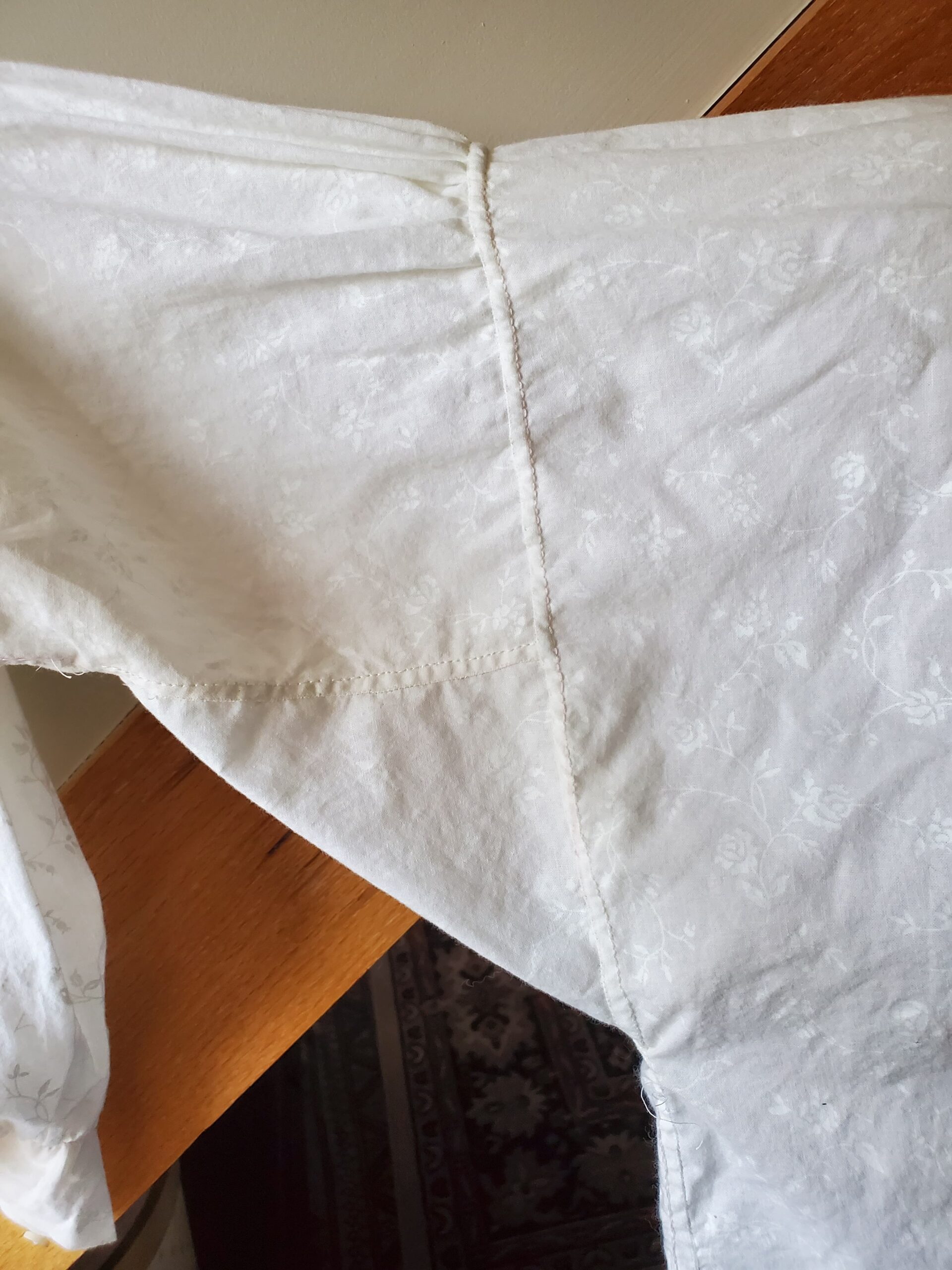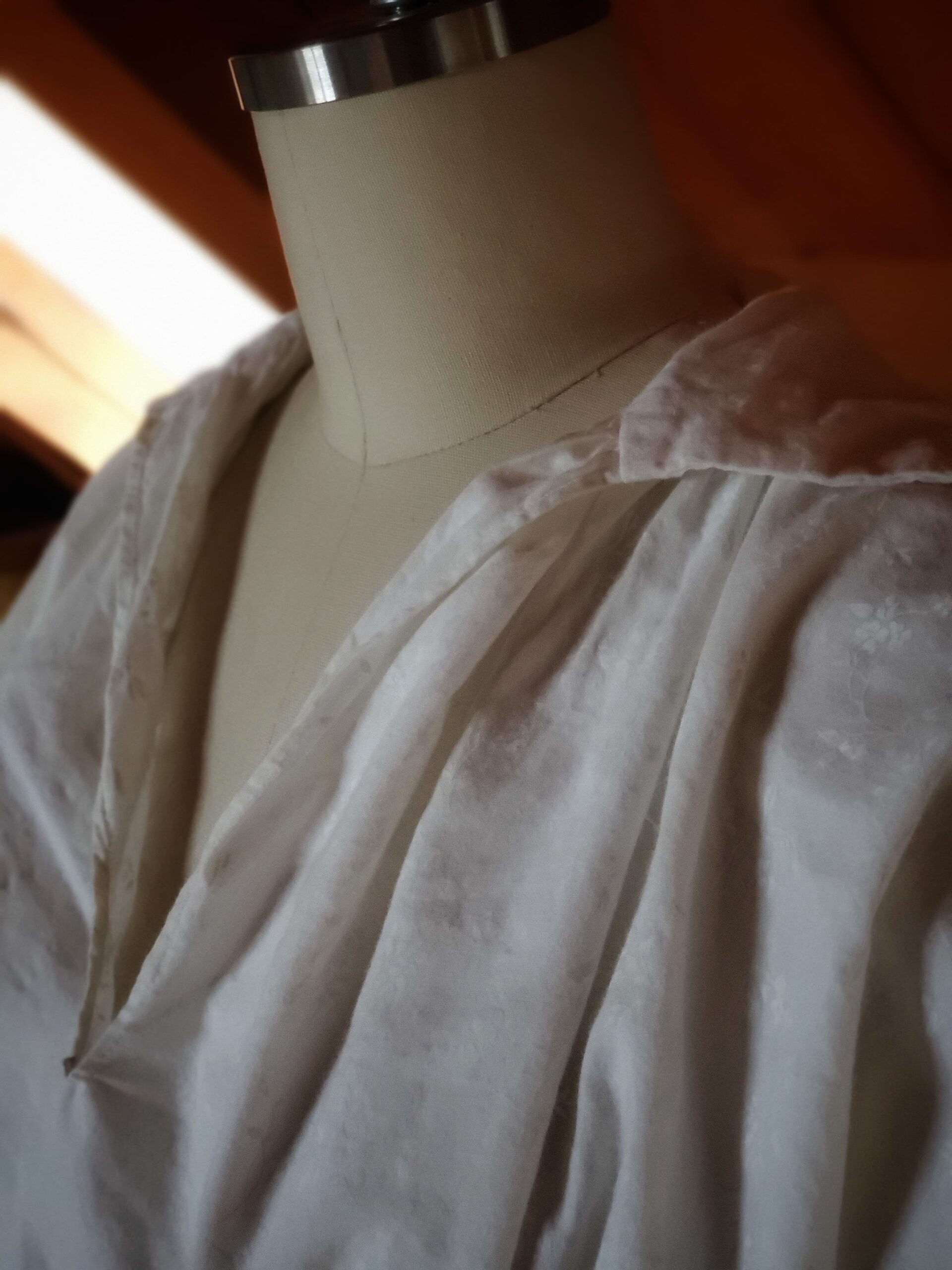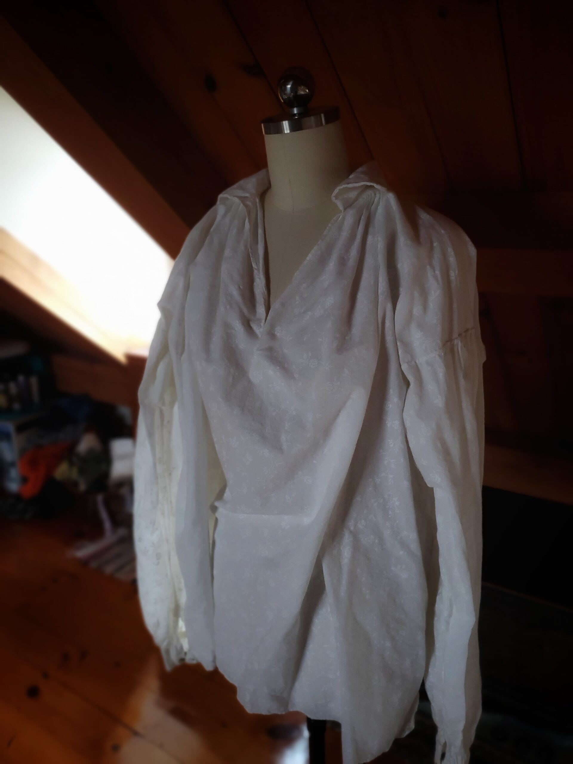 The basic building blocks of this kind of shirt are wonderfully simple—constructed entirely from squares and rectangles—so I took the opportunity to hand‑stitch the entire garment, just as it would have been made in the past. Working through this project taught me a variety of hand‑sewing techniques and deepened my understanding of historical garment construction. The shirt is made from cotton and finished with buttons at the sleeve cuffs.